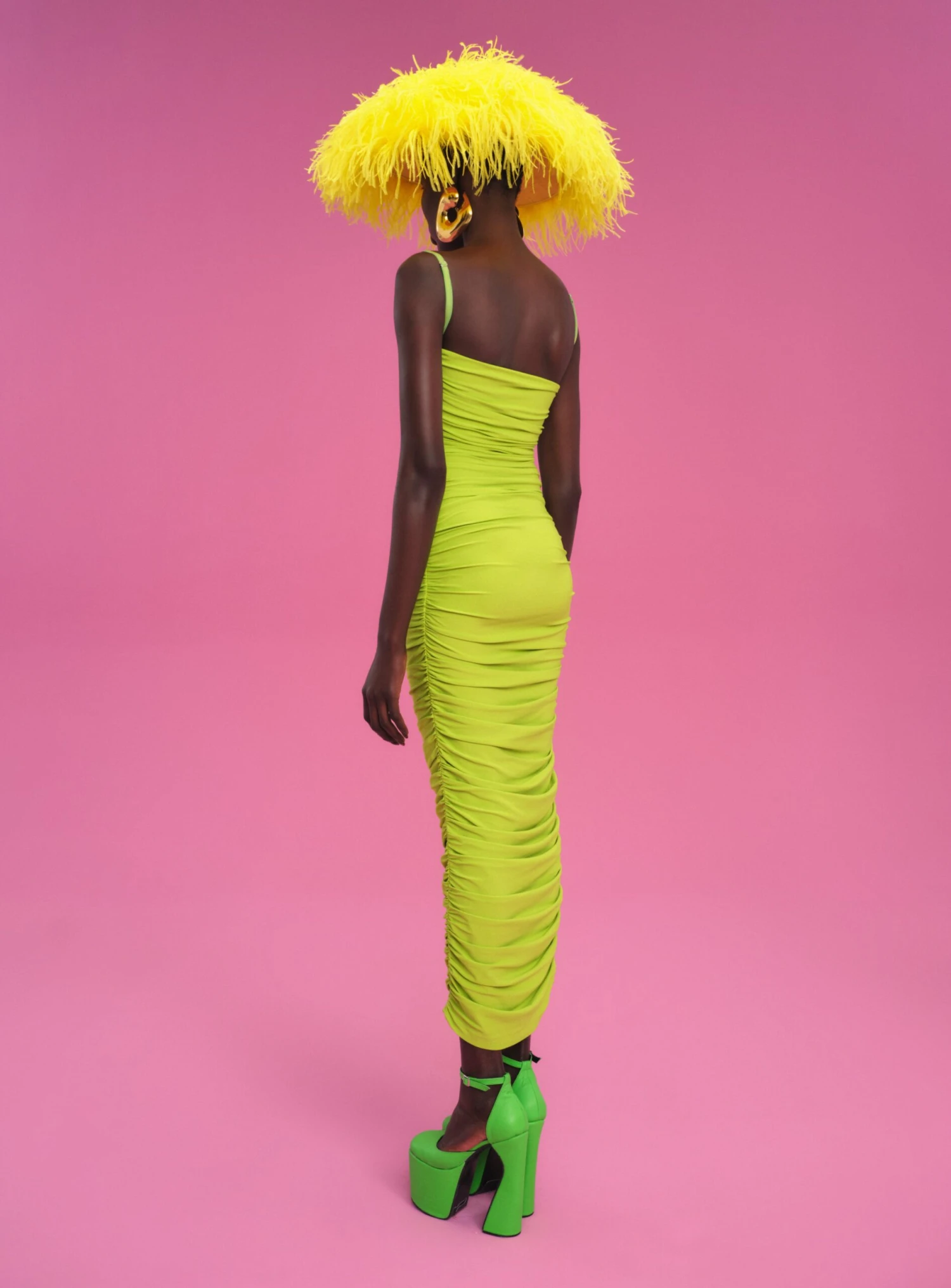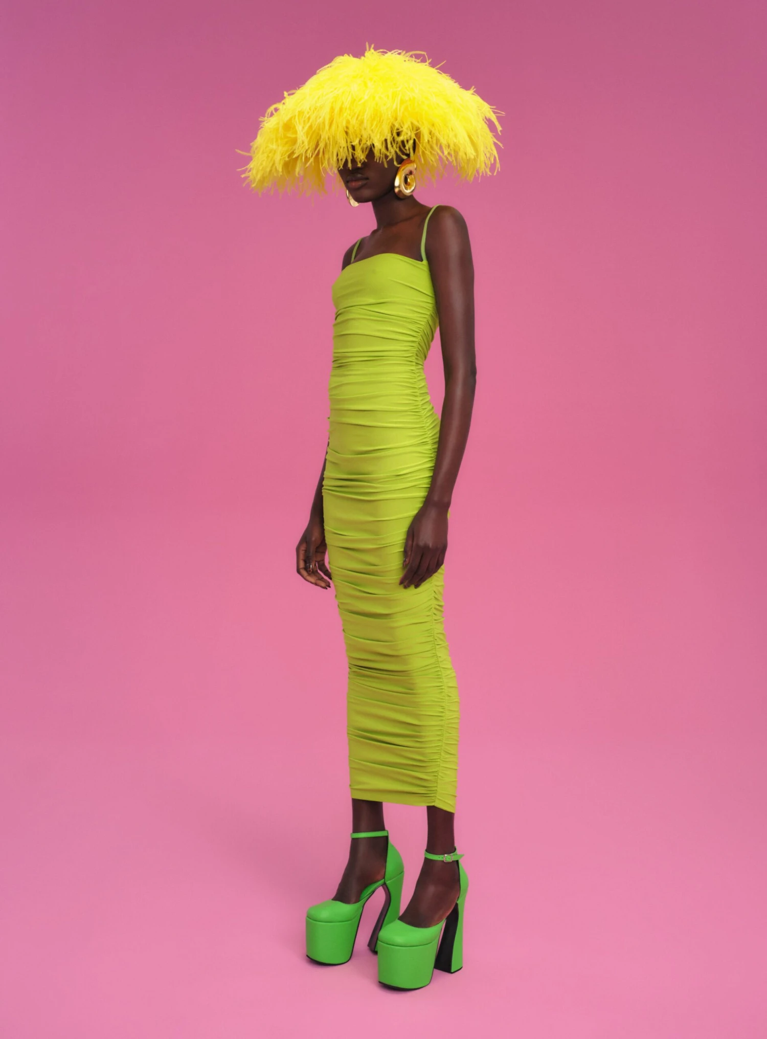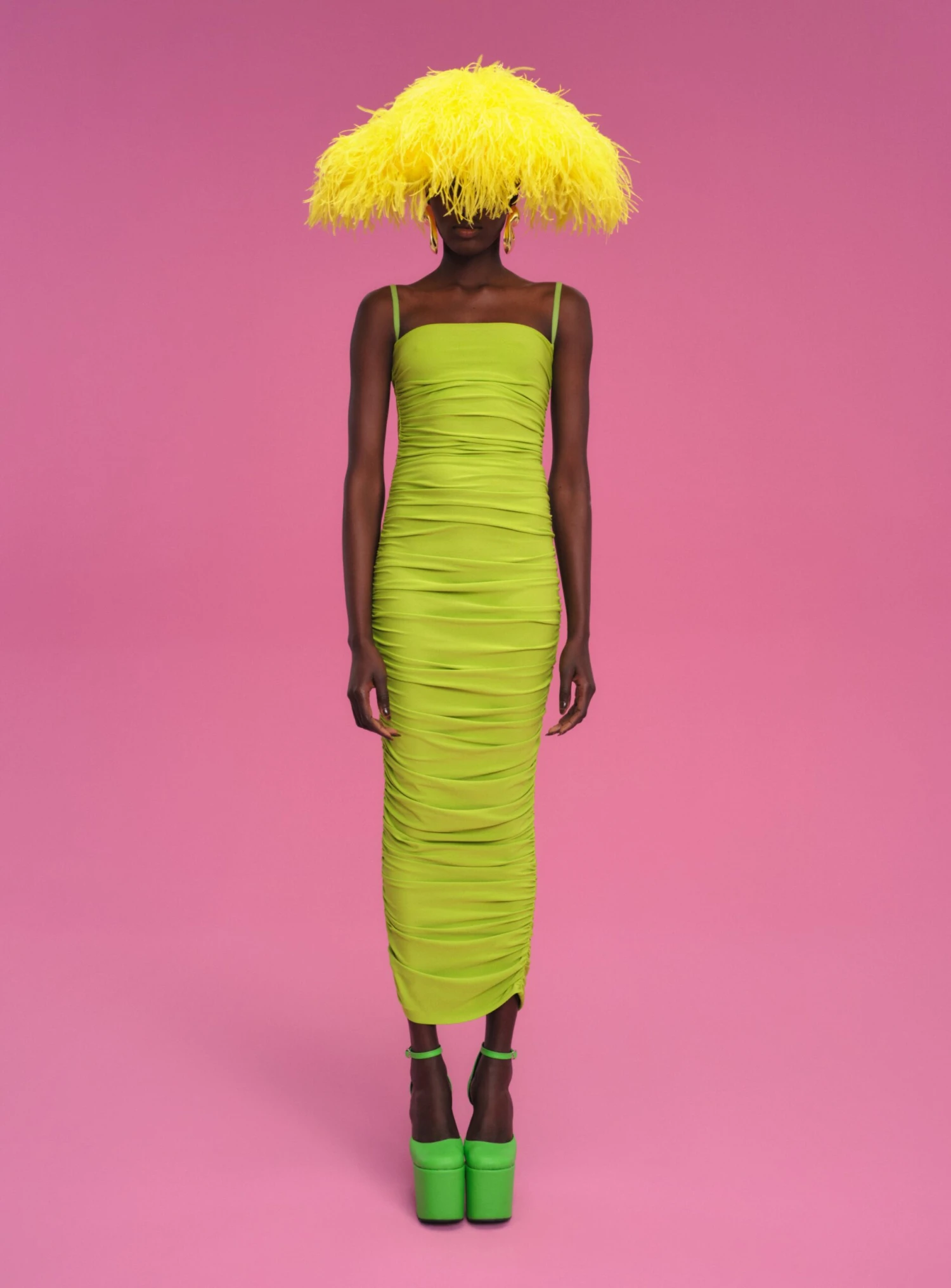 Ruched crepe knee length midi dress with square neckline and adjustable harness straps.