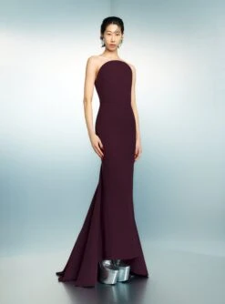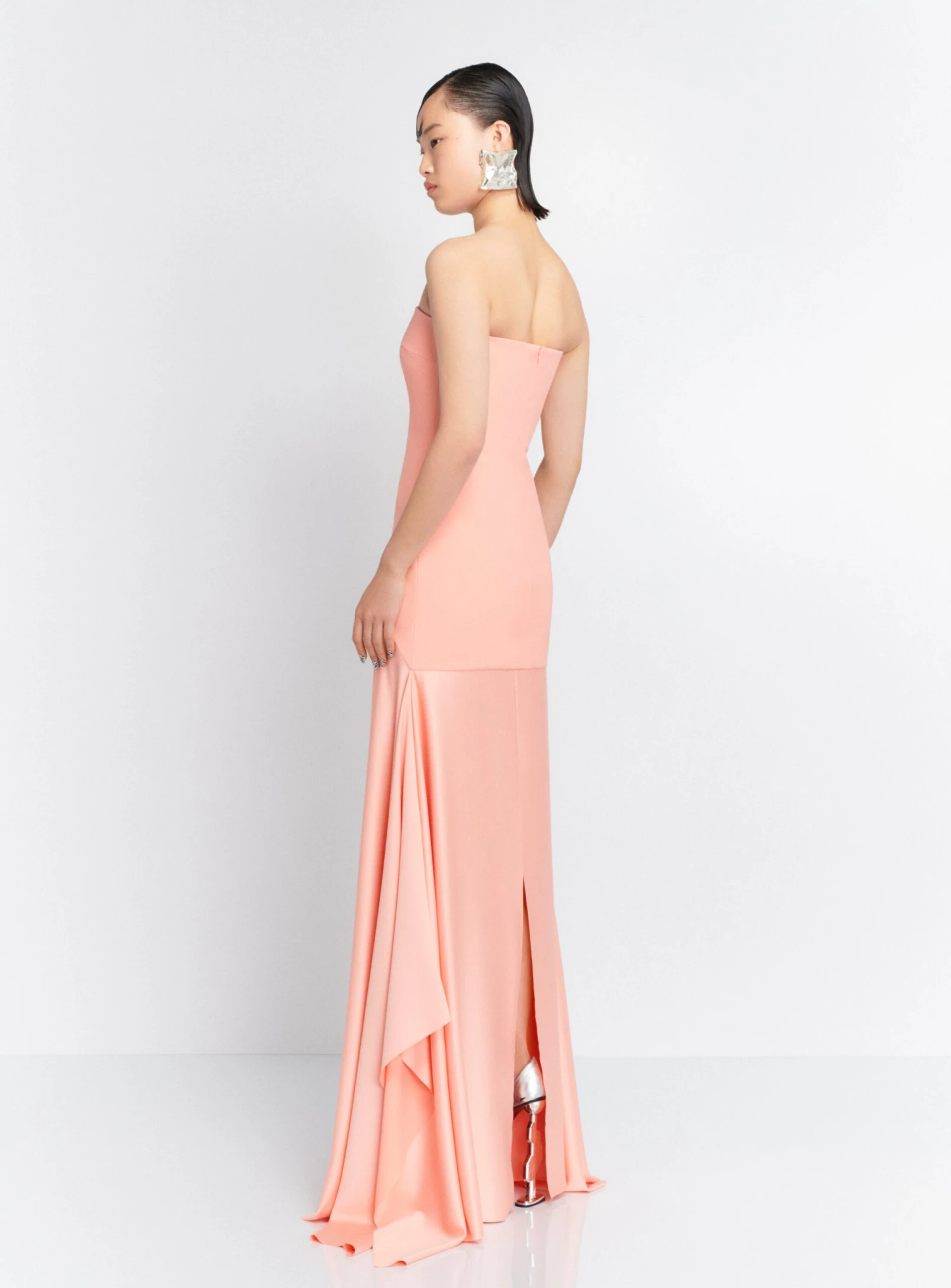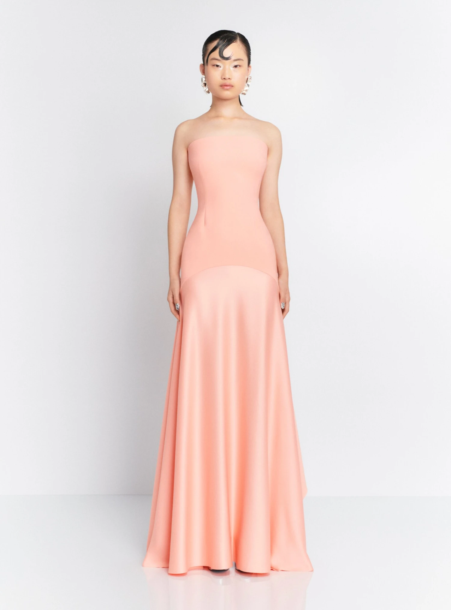 The Alessandra is a strapless floor length gown with a contrasting drop waist.