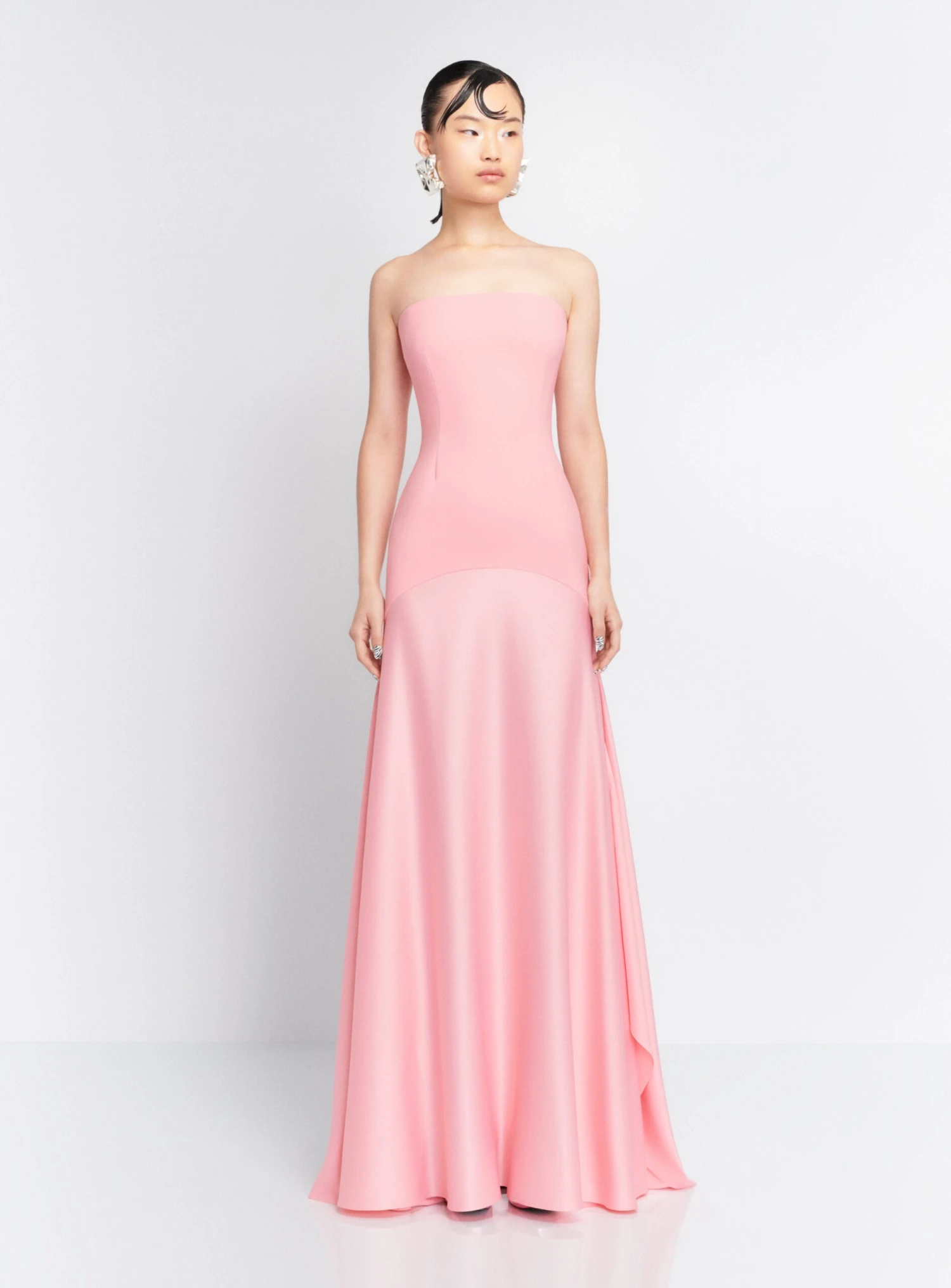 The Alessandra is a strapless floor length gown with a contrasting drop waist.