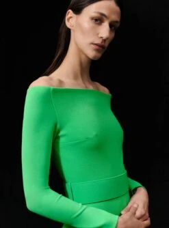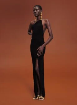 The Ally is a sleeveless floor length gown with draped asymmetric peplum and wide exaggerated neckline.