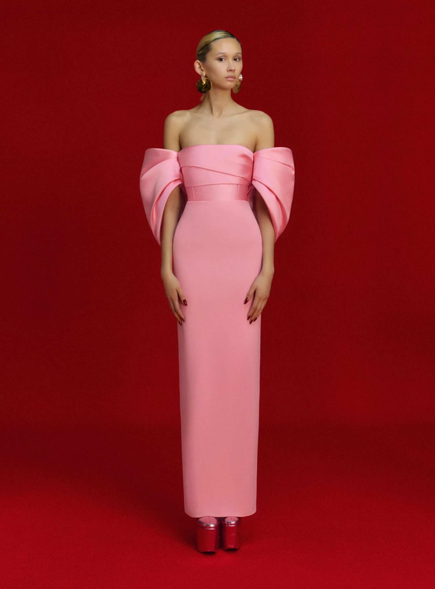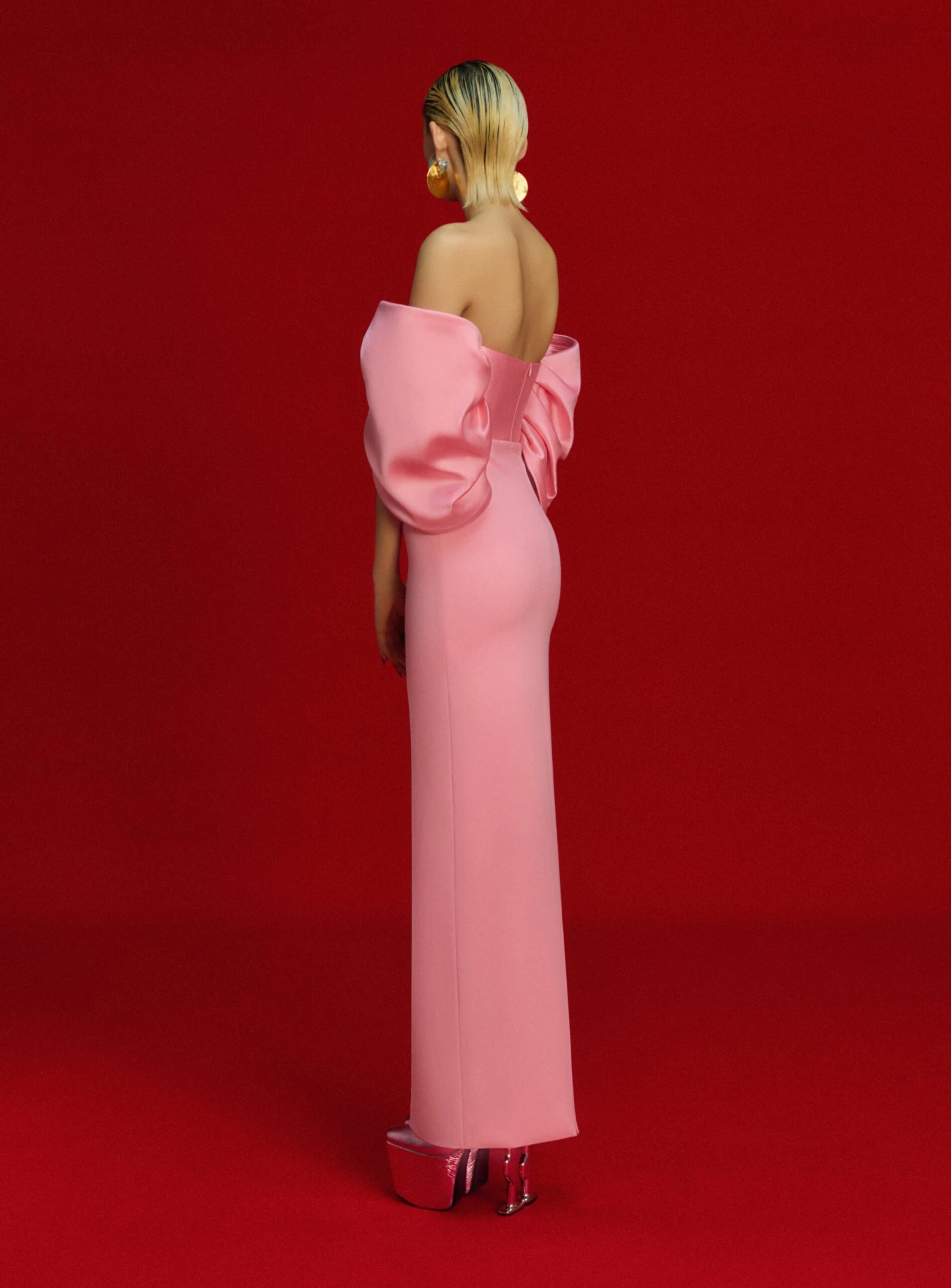 Modern strapless gown with sculptural sleeve and pleated bodice detail.