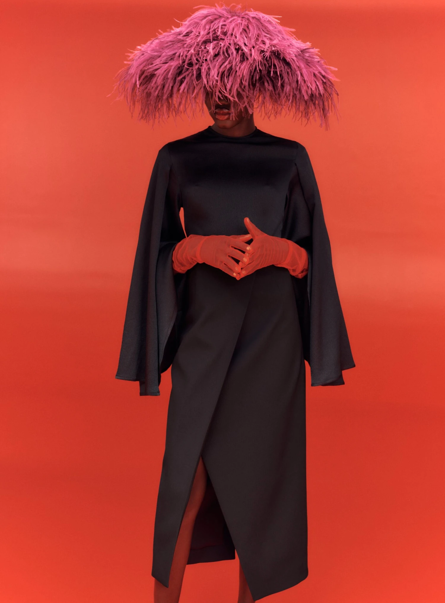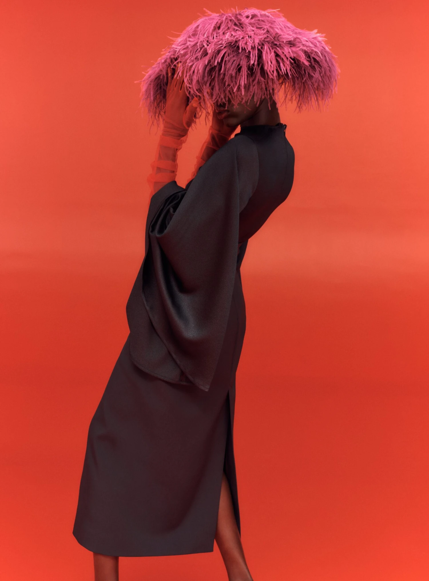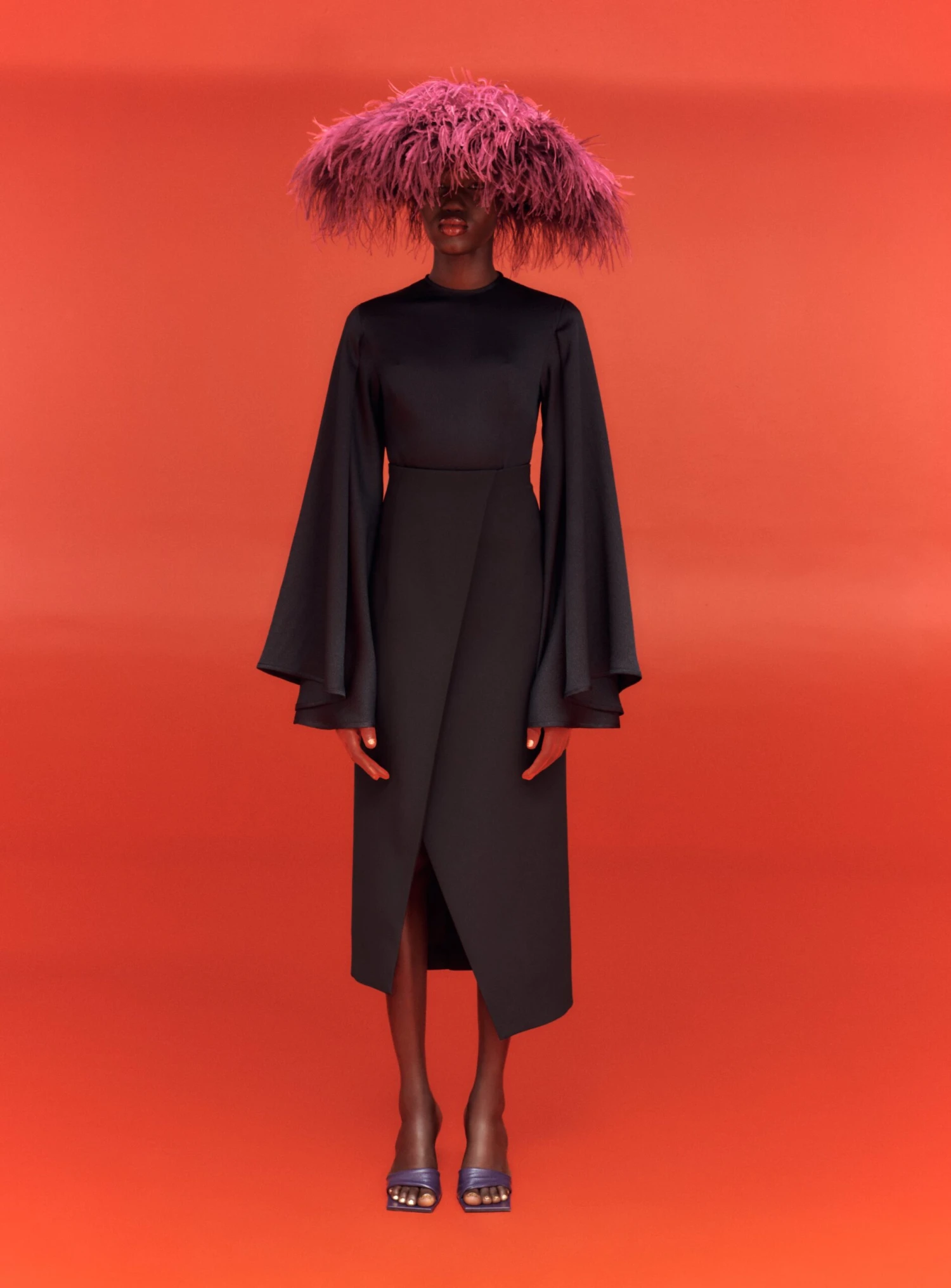 The Asta is a modest midi style featuring dramatic sleeves and a wrap style skirt. A versatile day to night staple piece.