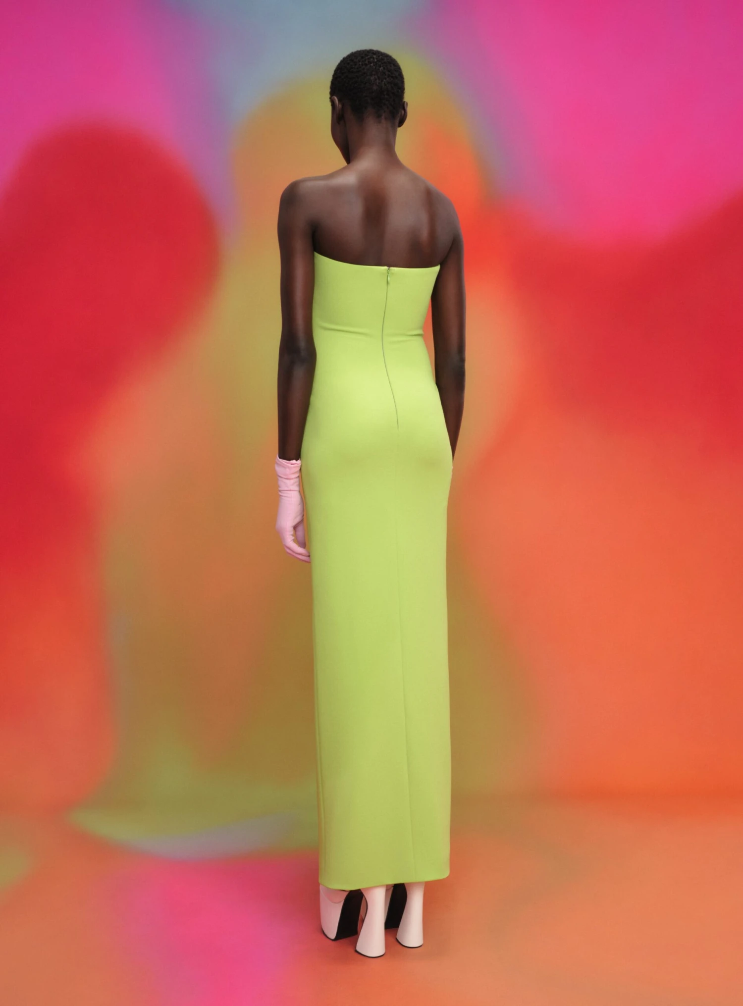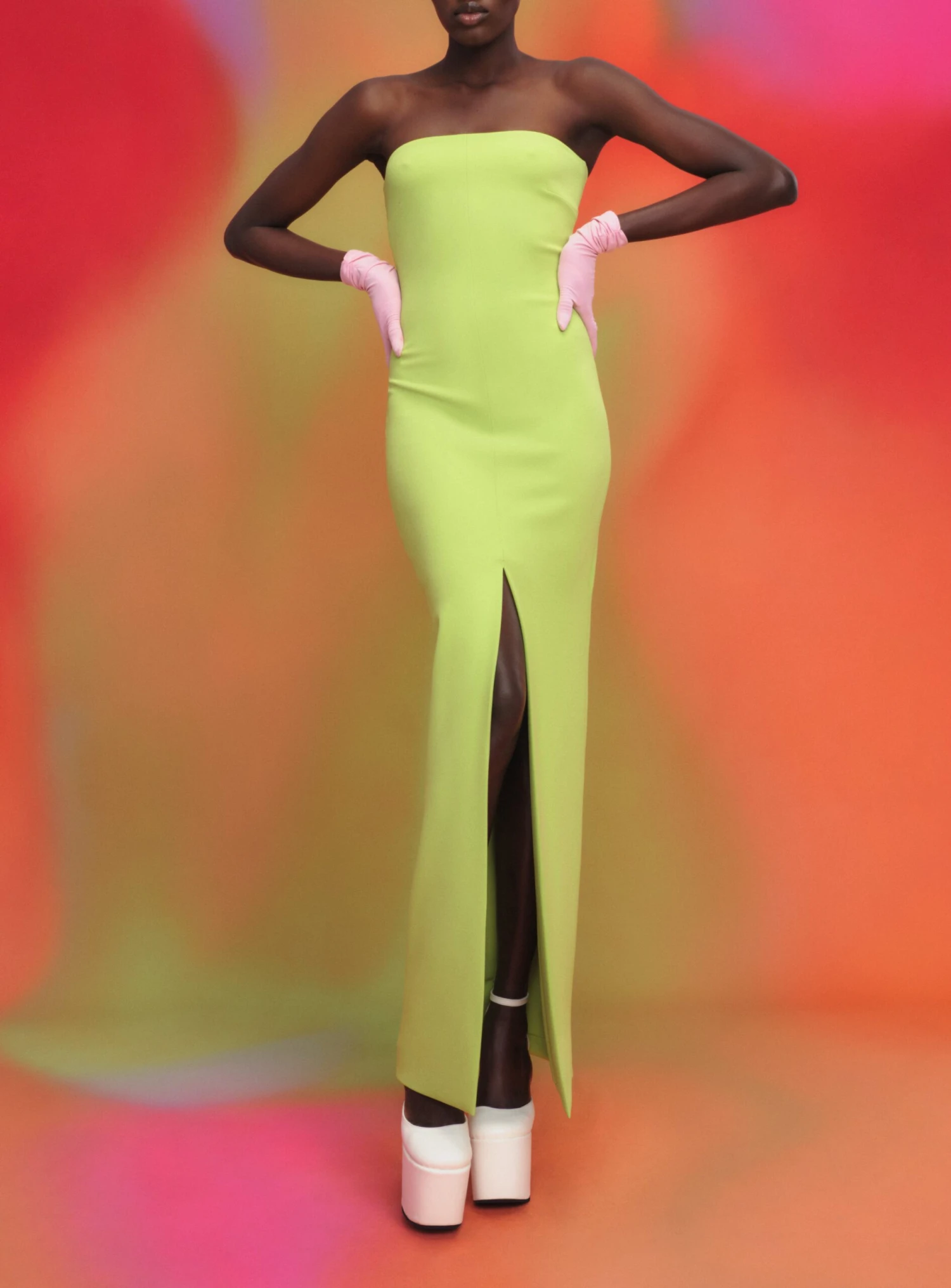 The Bysha is a strapless body sculpting maxi dress with centre front split detail