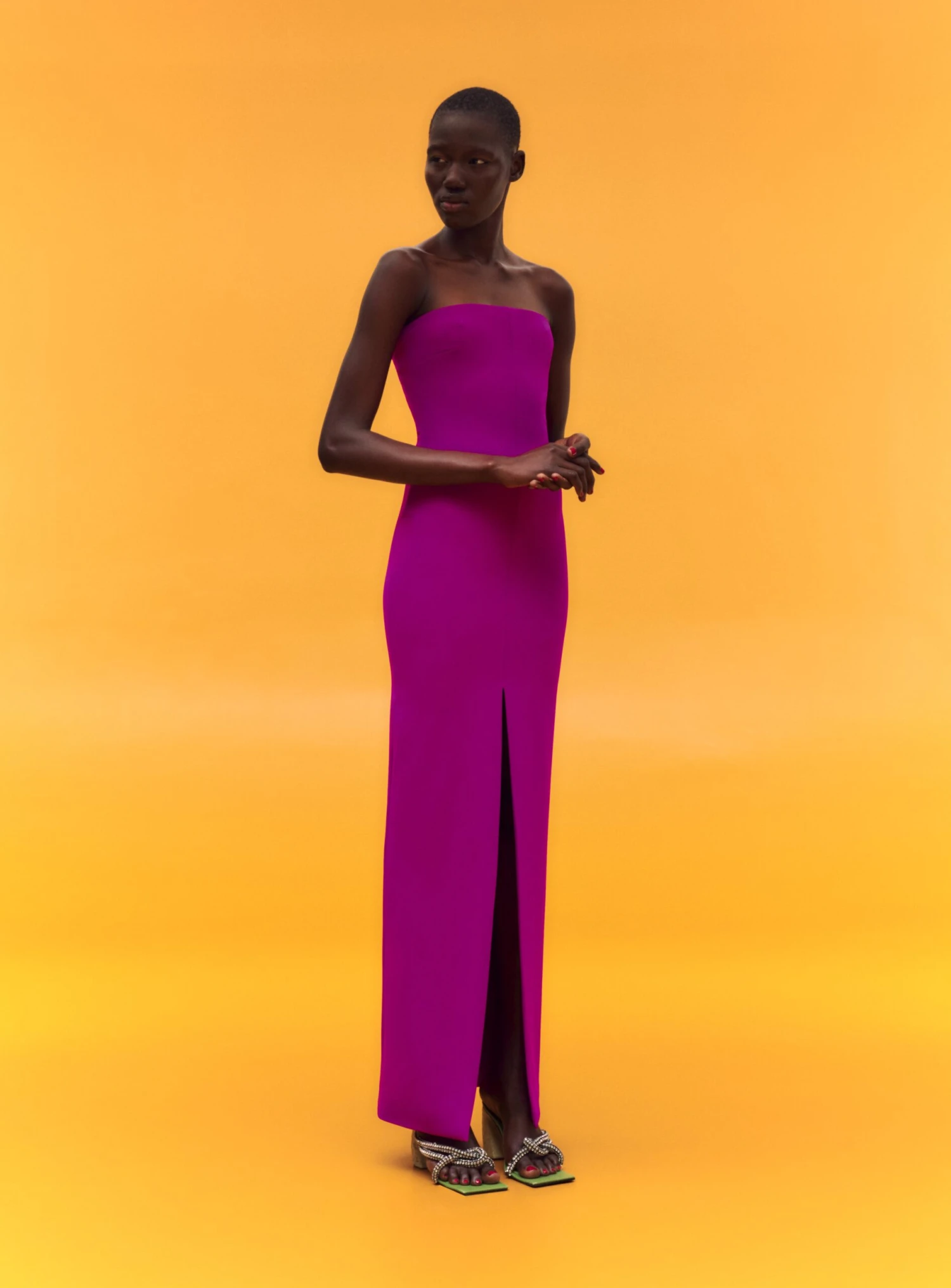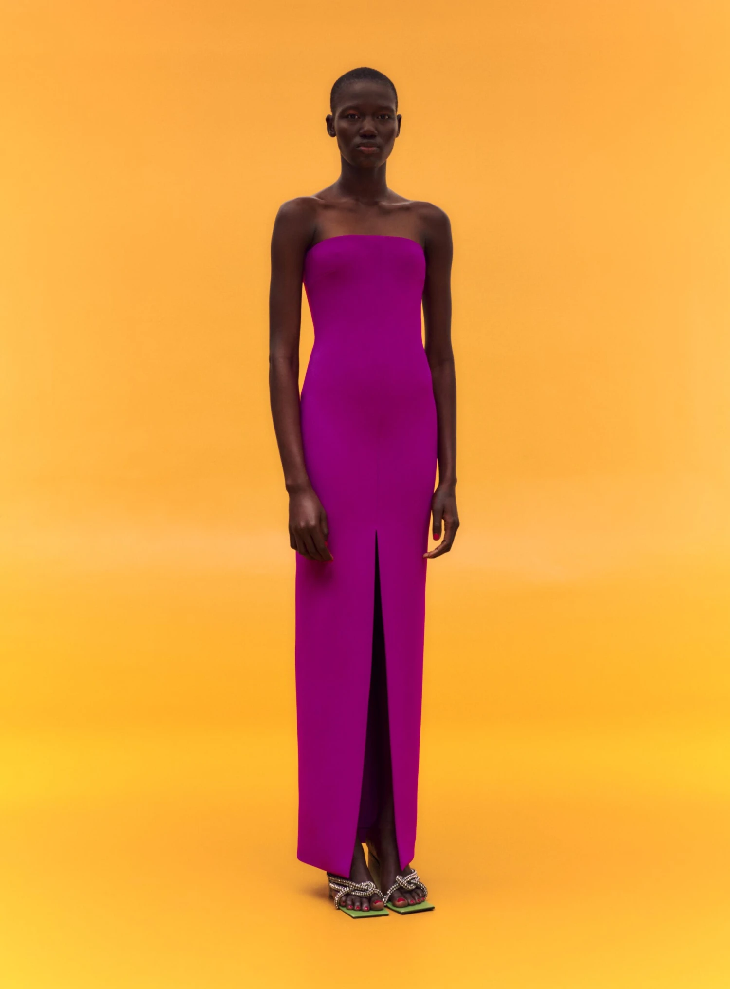 The Bysha is a strapless body sculpting maxi dress with centre front split detail.