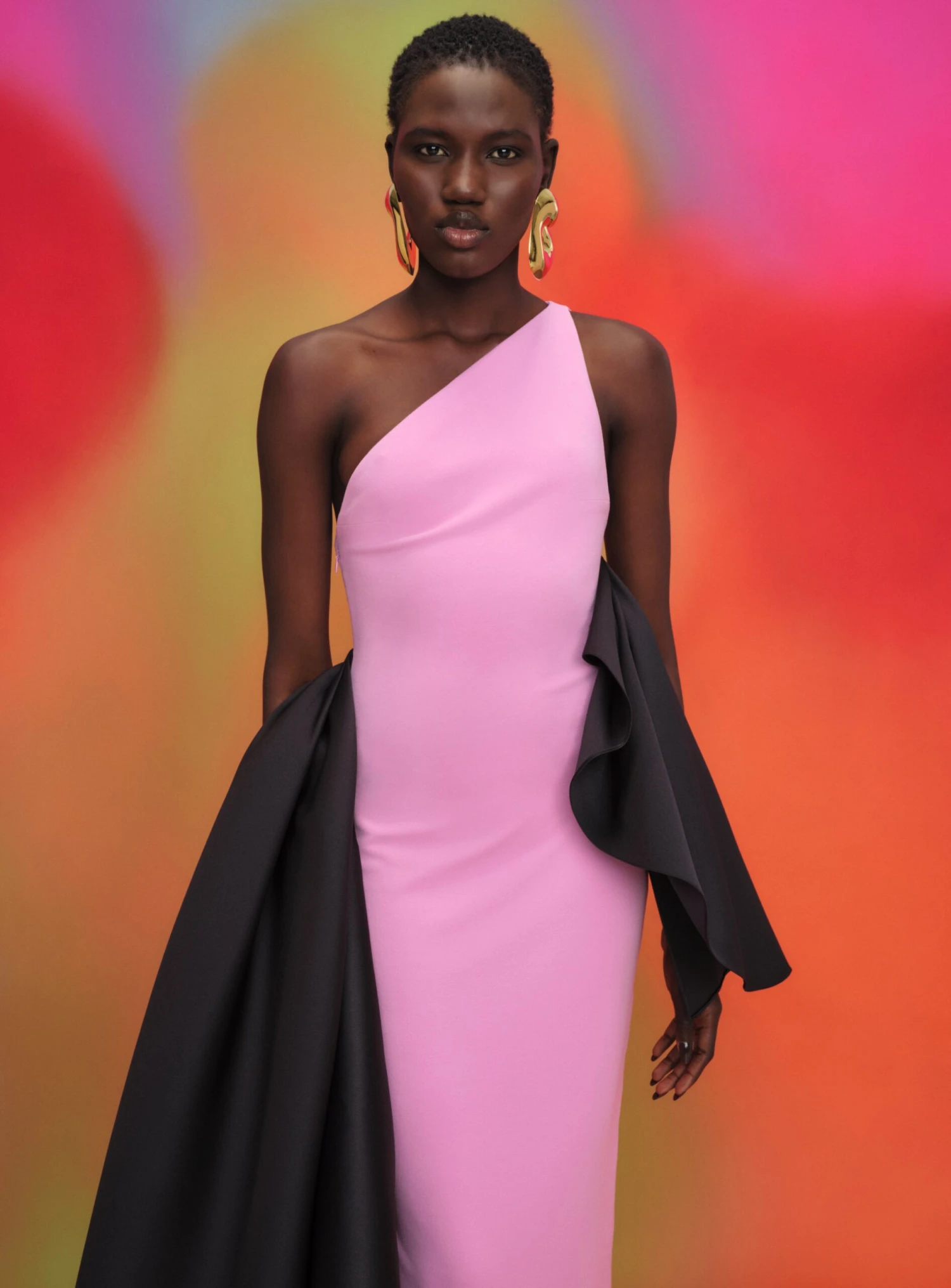 The Calla Maxi is a one shoulder column gown featuring a dramatic contrasting draped peplum.