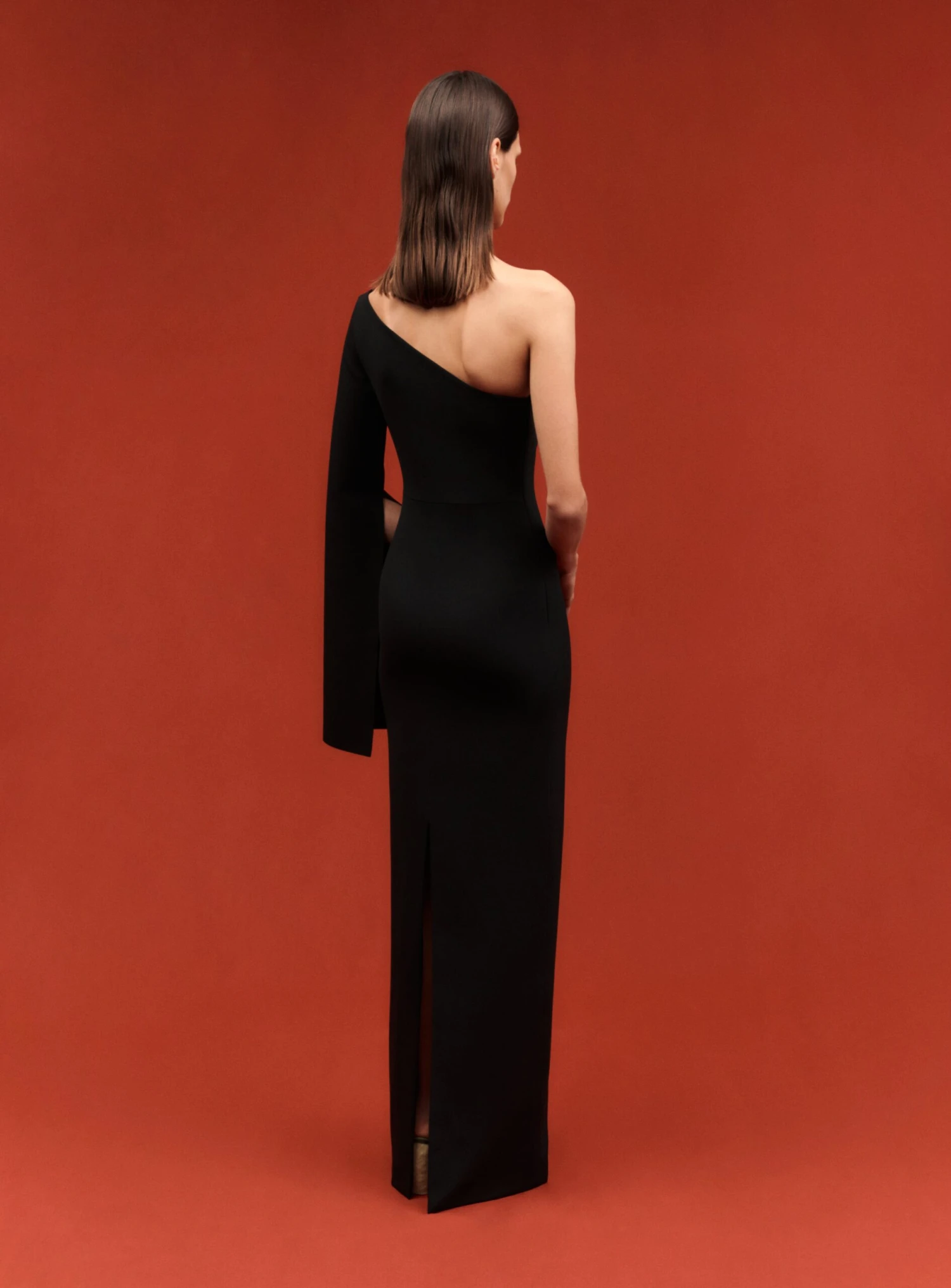 The Callie is an asymmetric one shoulder maxi dress with a dramatic statement sleeve.