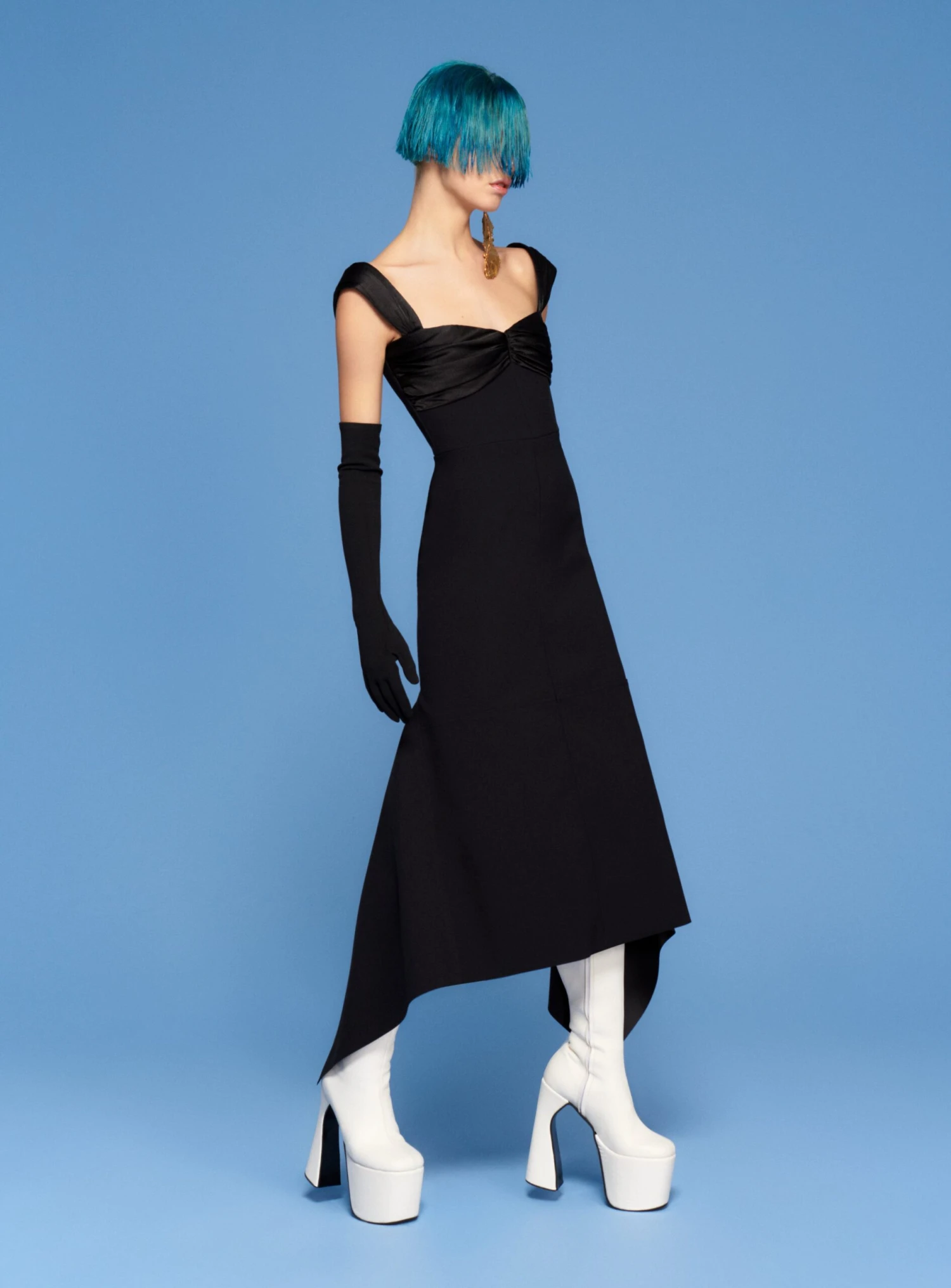 The Dahlia is a bodyscuplting cocktail dress with draped bust cups and a flared handkerchief hemline