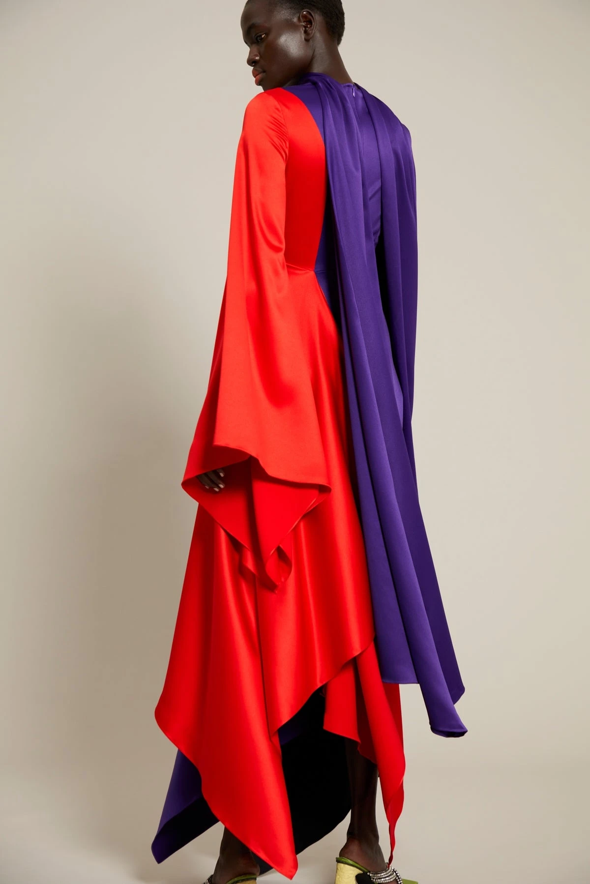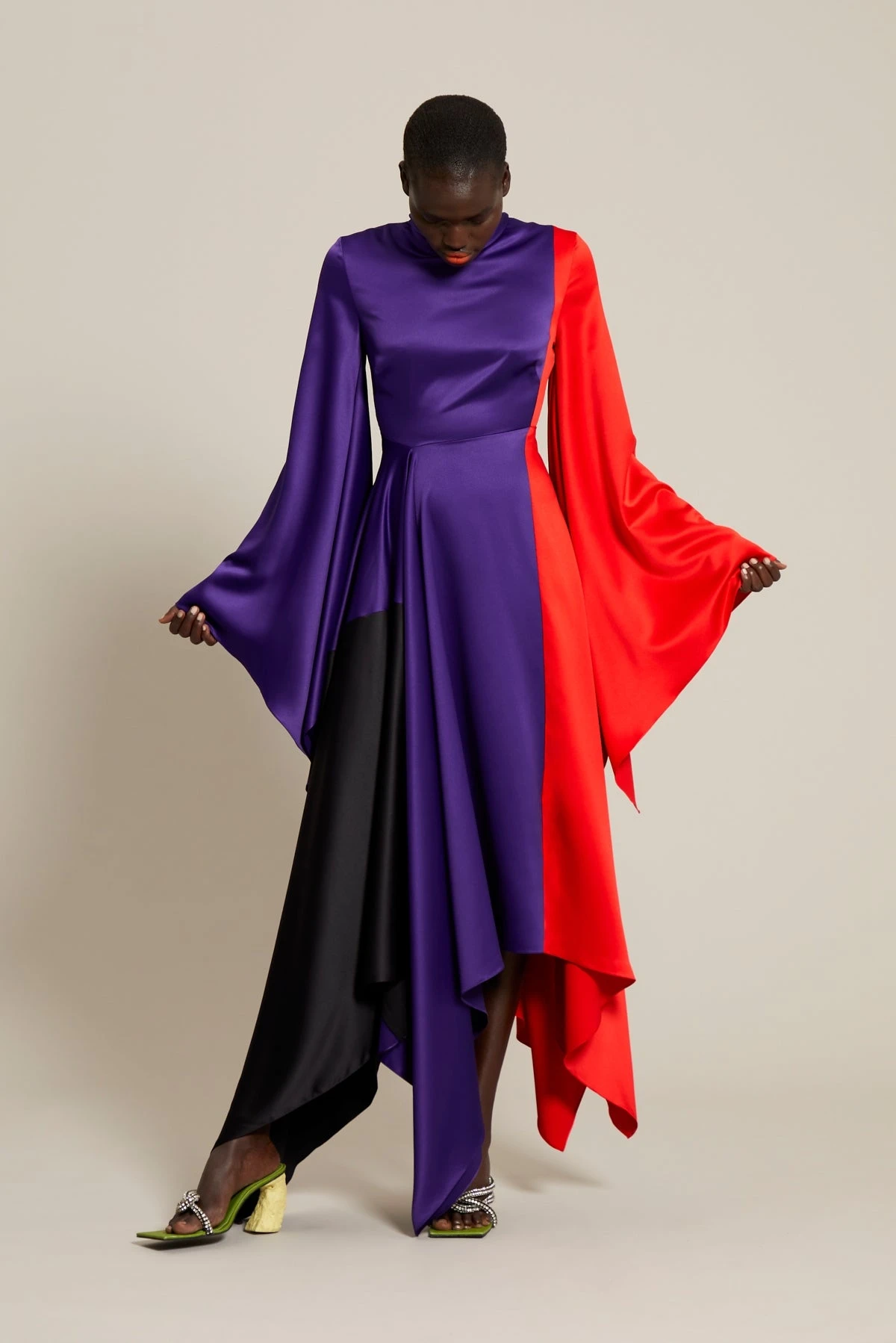 The Ella is a midaxi style featuring a handkerchief hemline and dramatic flag sleeves.