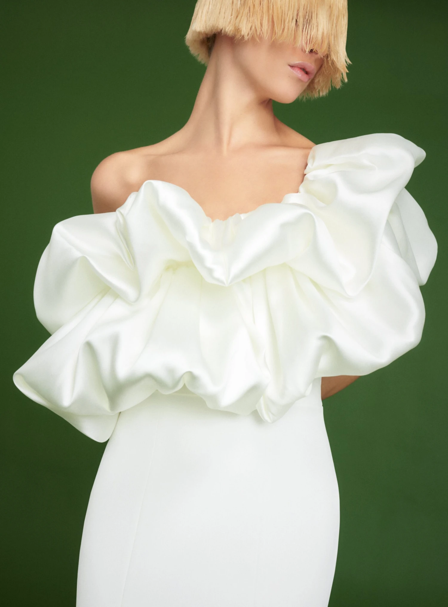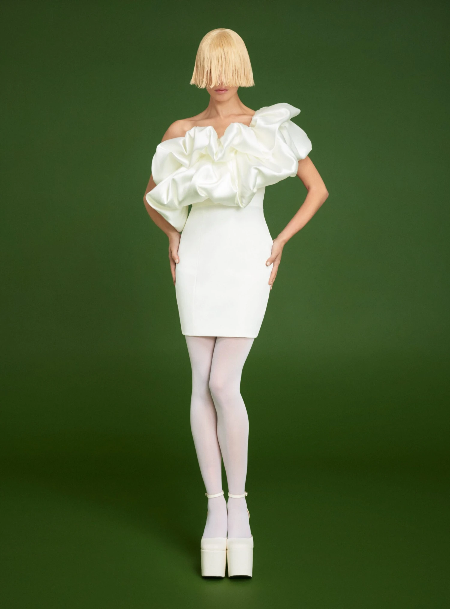 The Finley is a body conscious one shoulder mini style with dramatic sculptural ruffle.