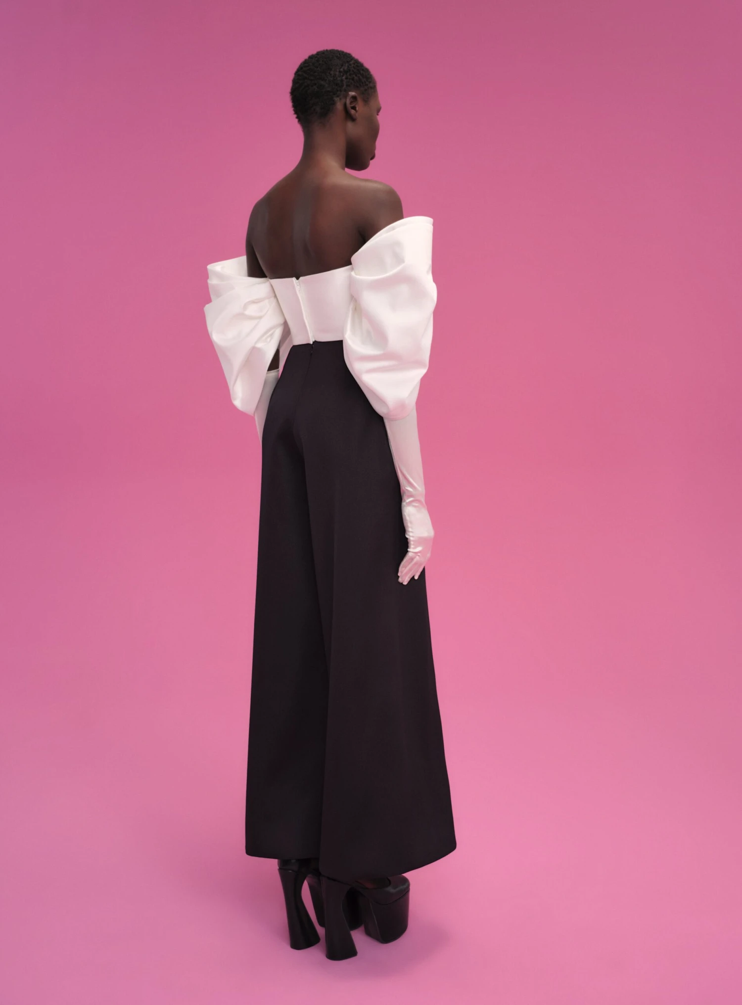 The Freya is a modern strapless jumpsuit with dramatic draped sleeves and flared trousers.