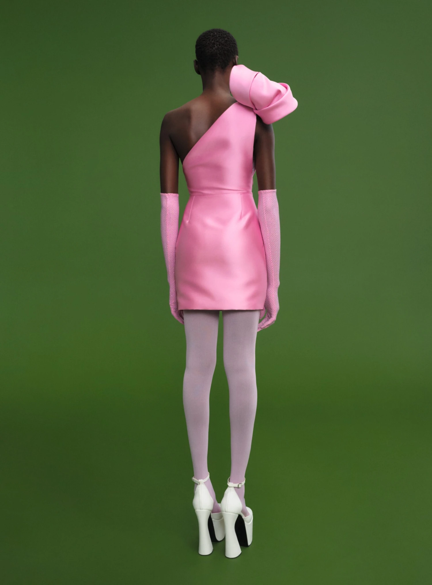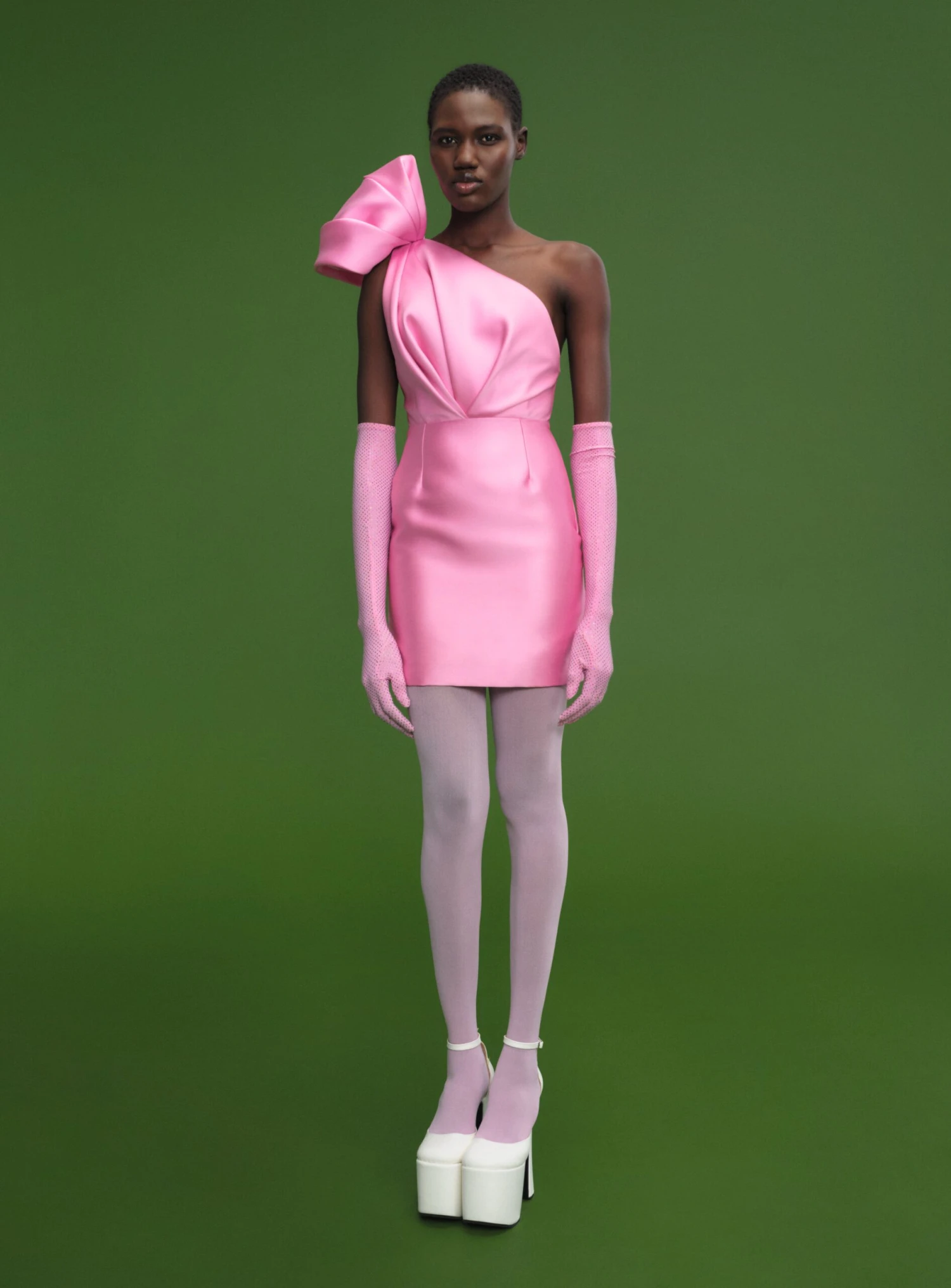 The Frida is a one shoulder mini dress with dramatic bow detail and pleated bodice.