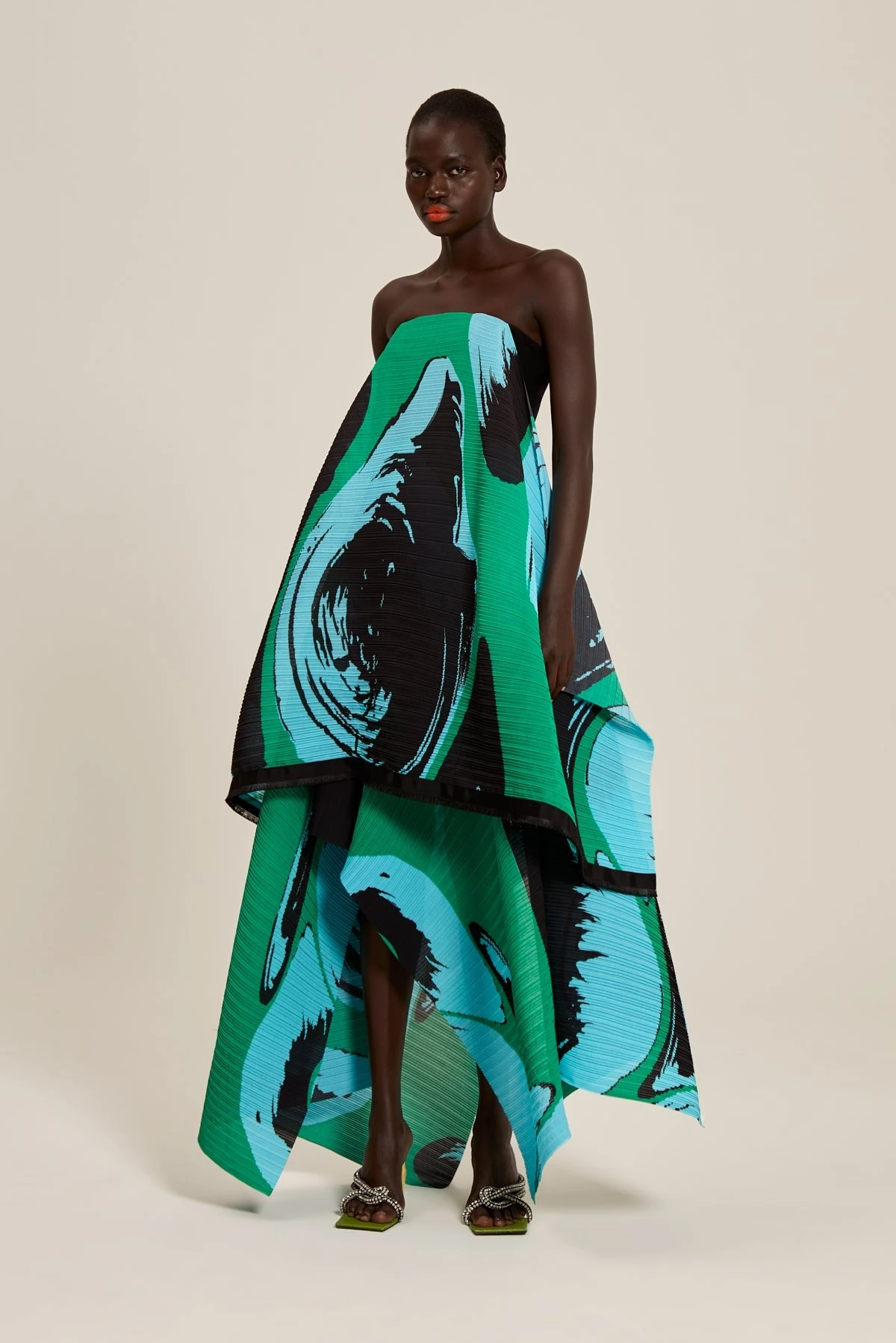 The Hester is a strapless modern gown with asymmetrical handkerchief hemline.