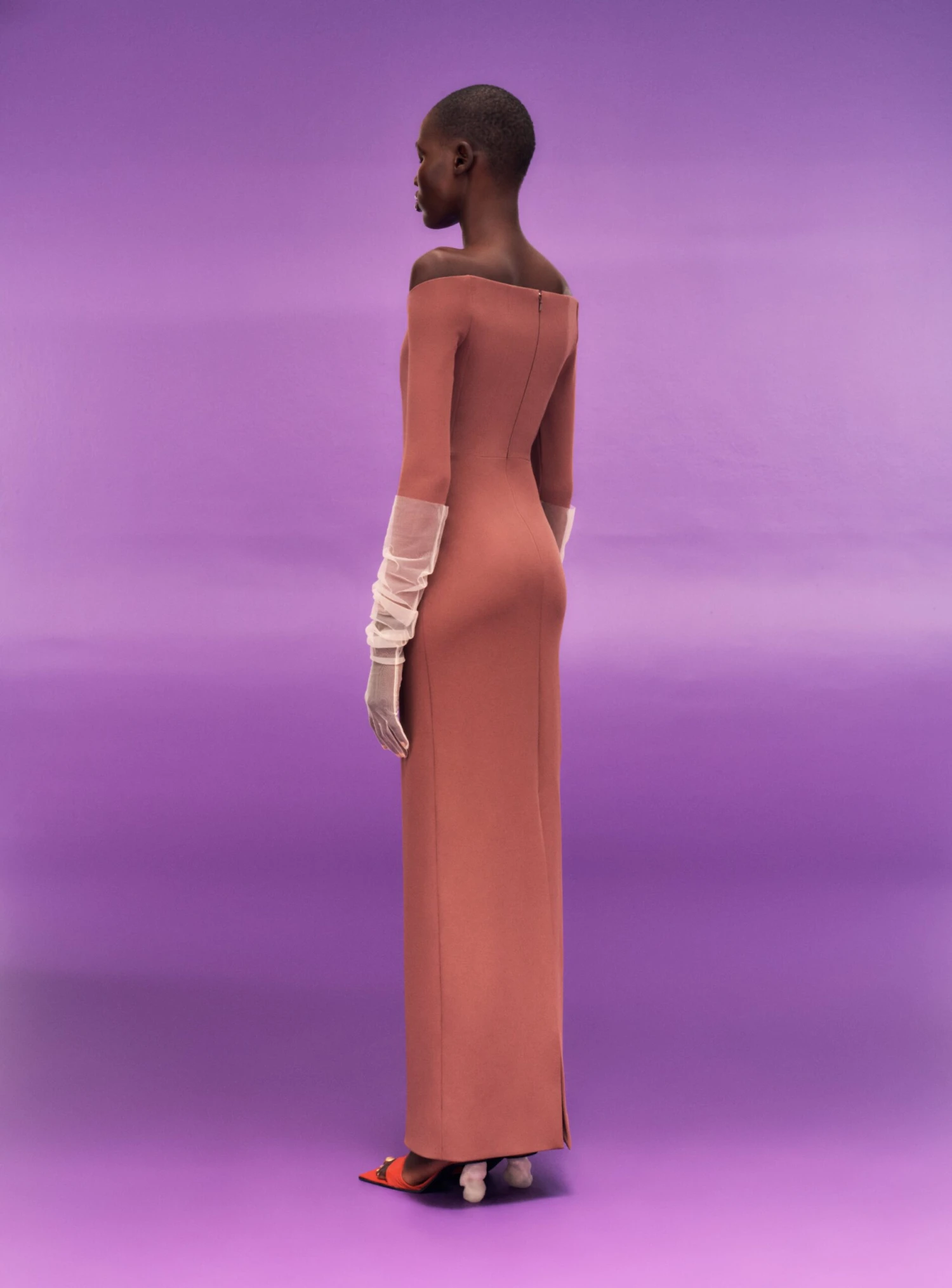 The Kae is a long sleeve column silhouette gown with a sculpted off the shoulder neckline.