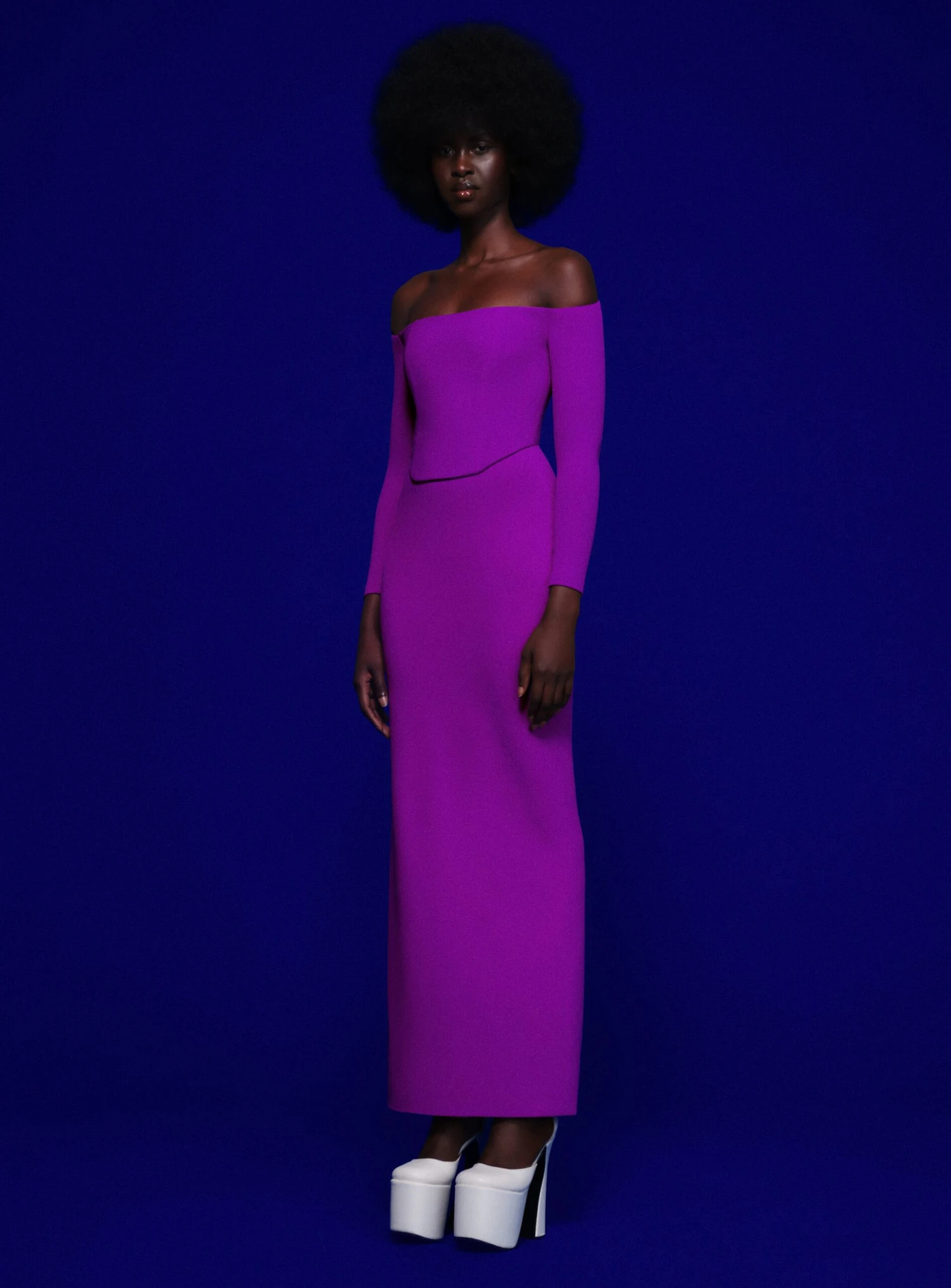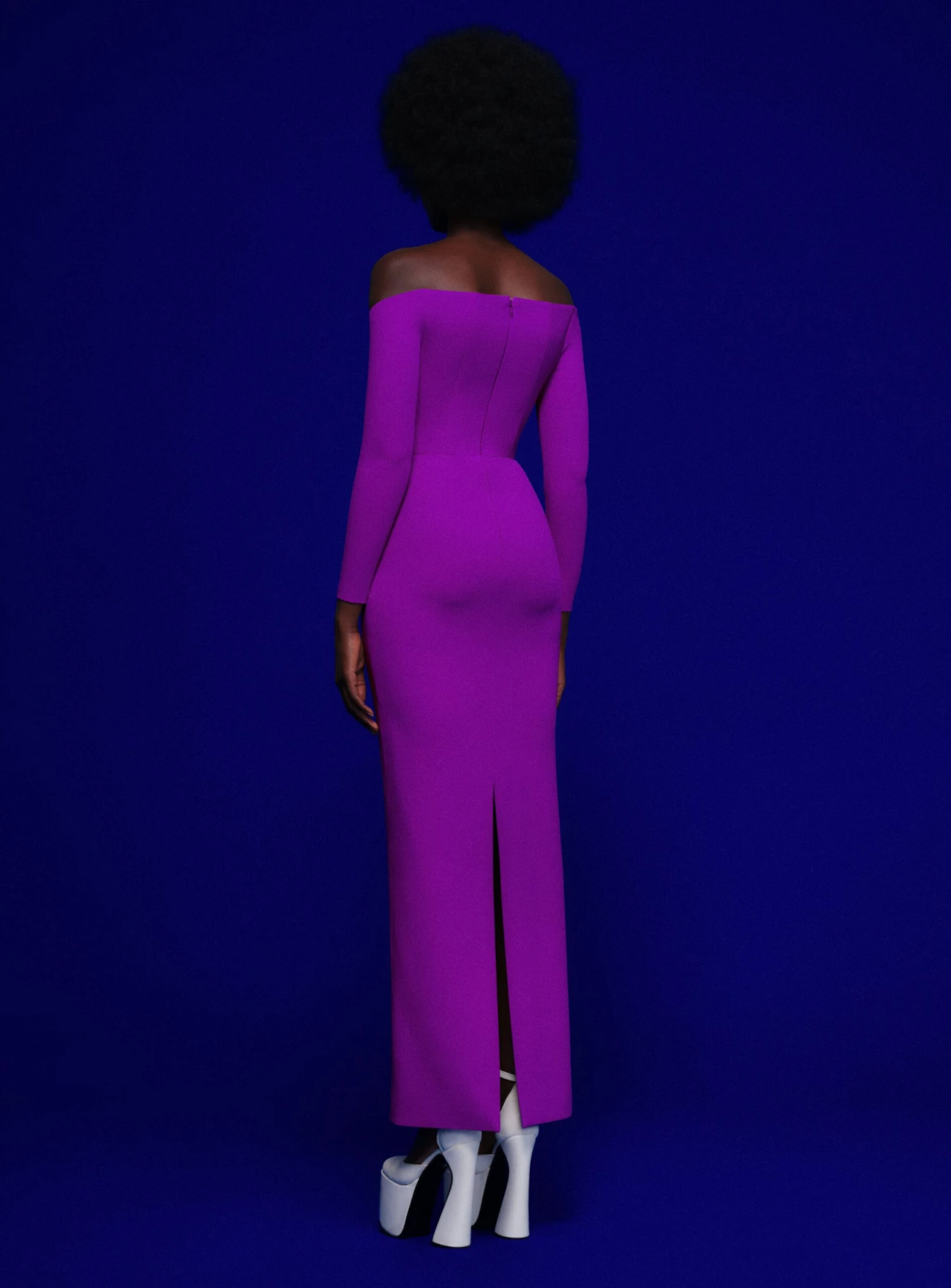 The Kae is a long sleeve column silhouette gown with a sculpted off the shoulder neckline.