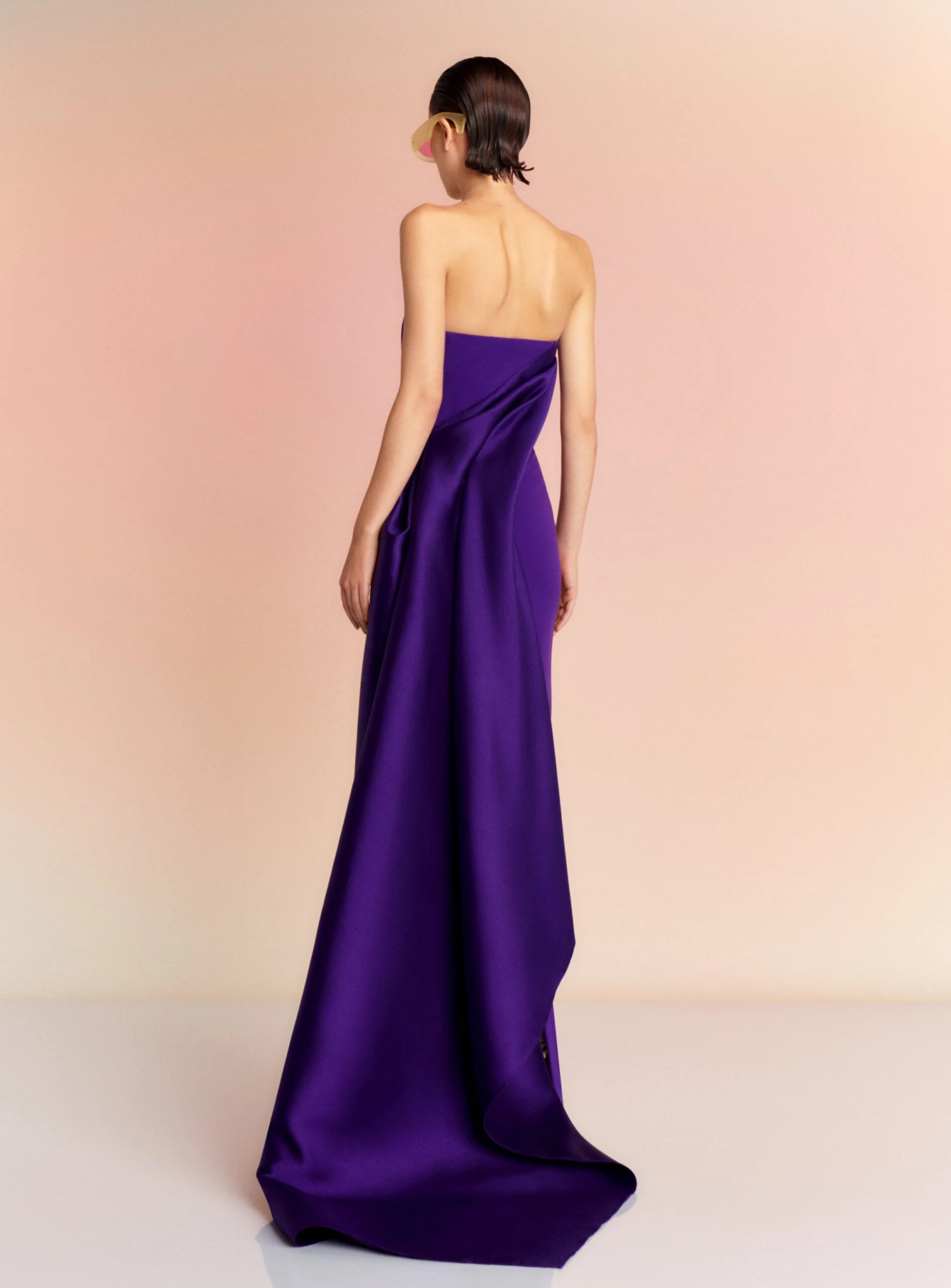 The Kinsley is a strapless column style gown featuring a softly pleated bodice and wrap around drape detail.