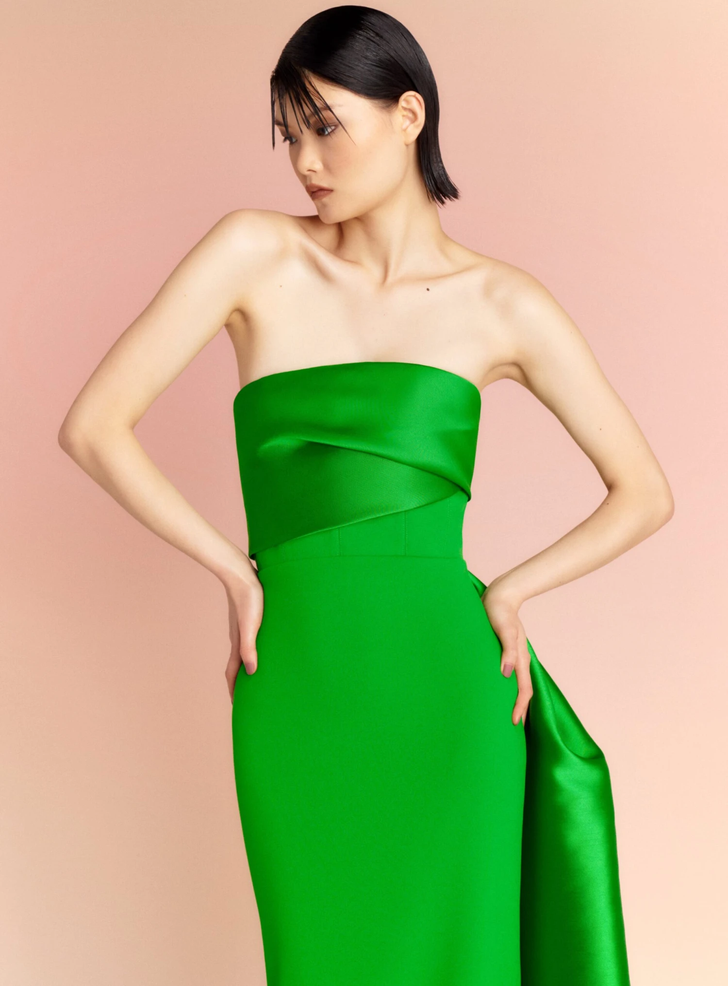 The Kinsley is a strapless column style gown featuring a softly pleated bodice and wrap around drape detail.