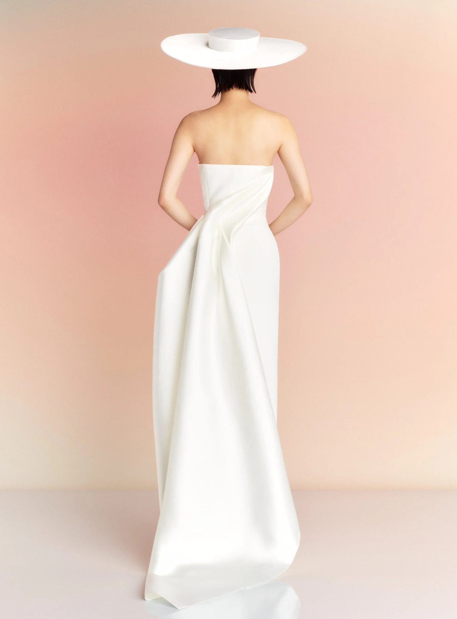 The Kinsley is a strapless column style gown featuring a softly pleated bodice and wrap around drape detail.
