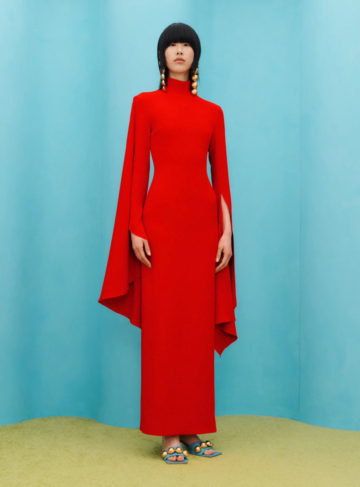 The Layla maxi is a modern gown featuring exaggerated asymmetric sleeves and a high neck.