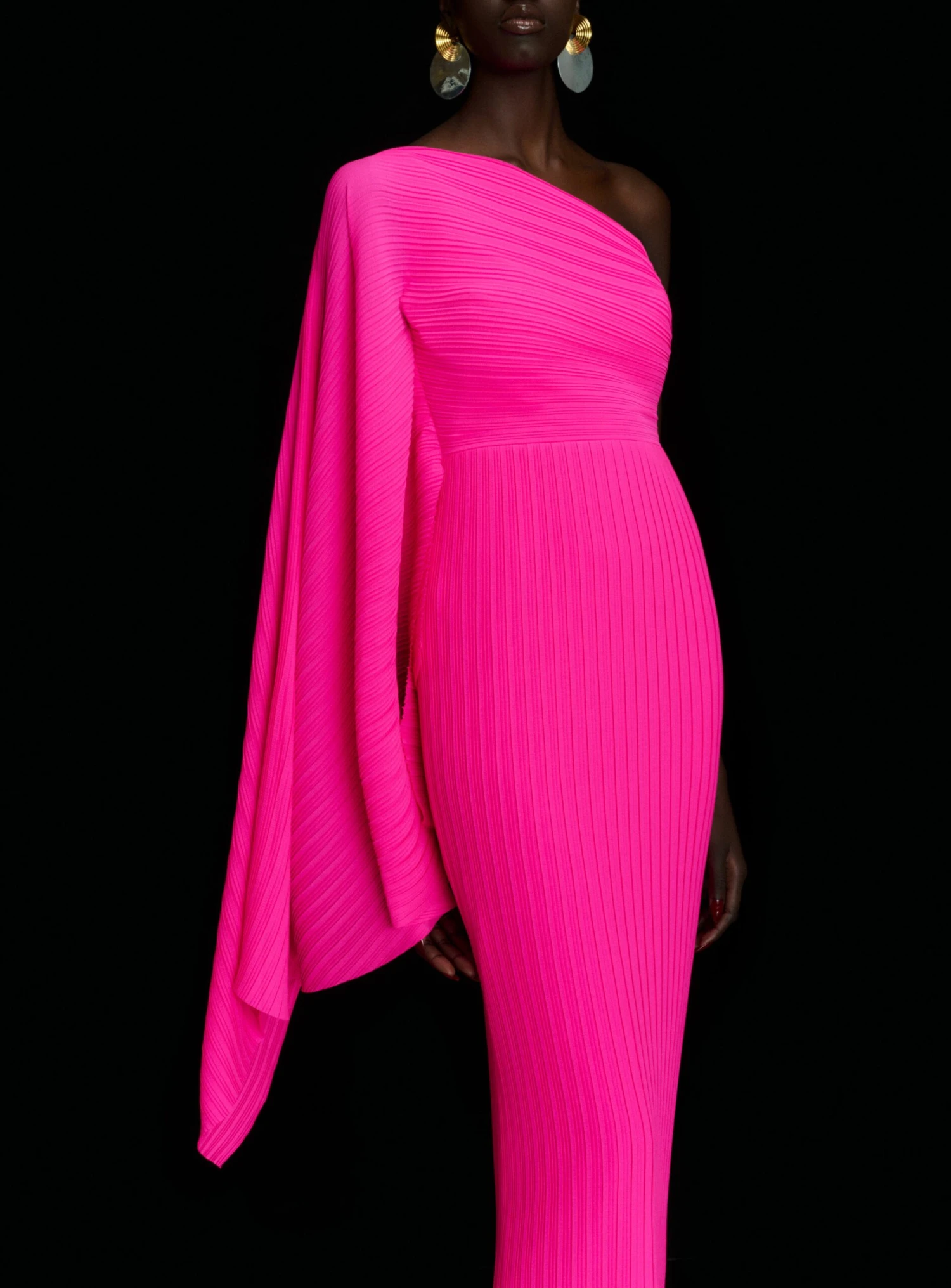 The Lenna is a one-shoulder midi style featuring an asymmetric kimono style sleeve.