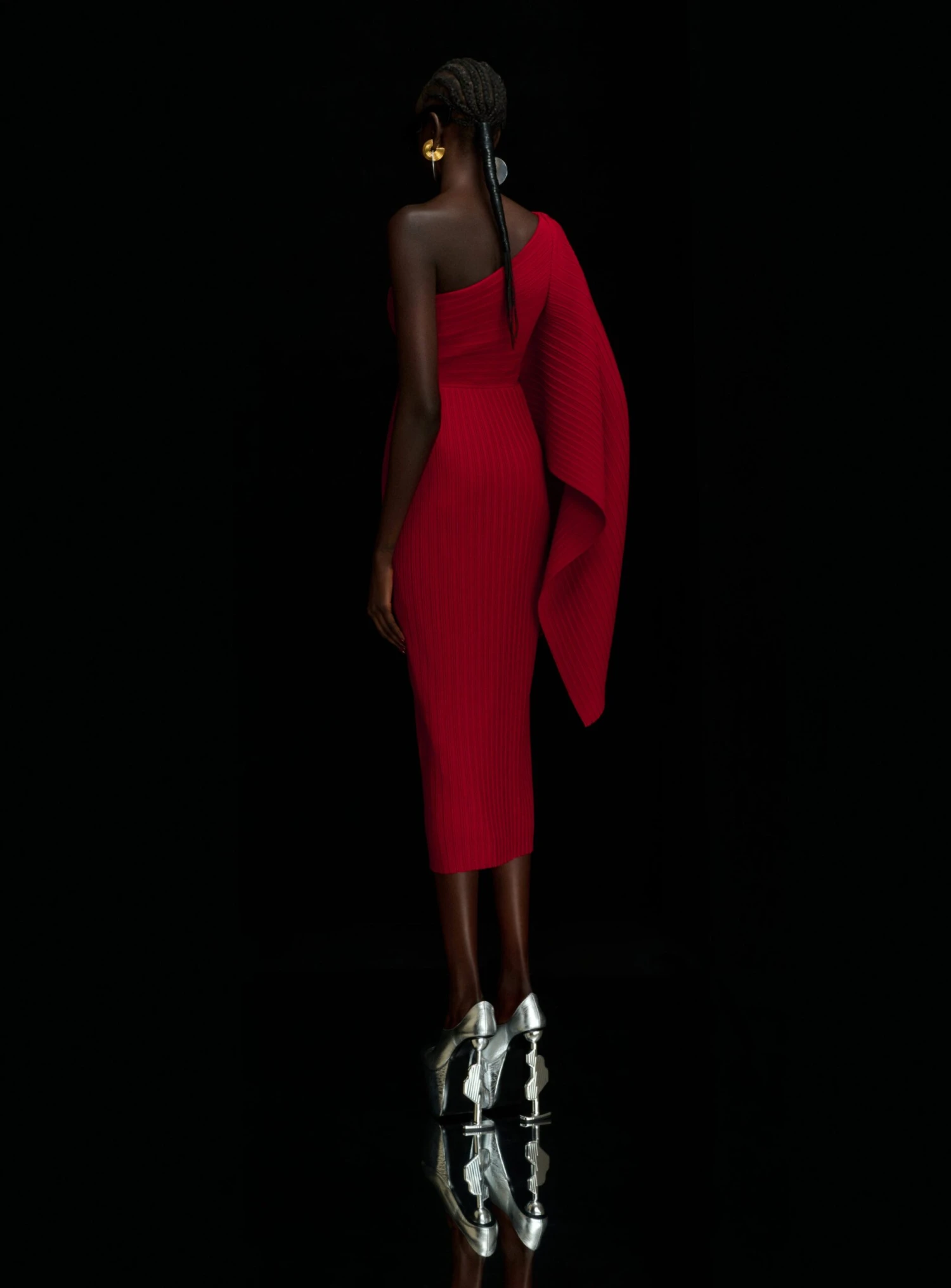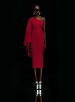 The Lenna is a one-shoulder midi style featuring an asymmetric kimono style sleeve.