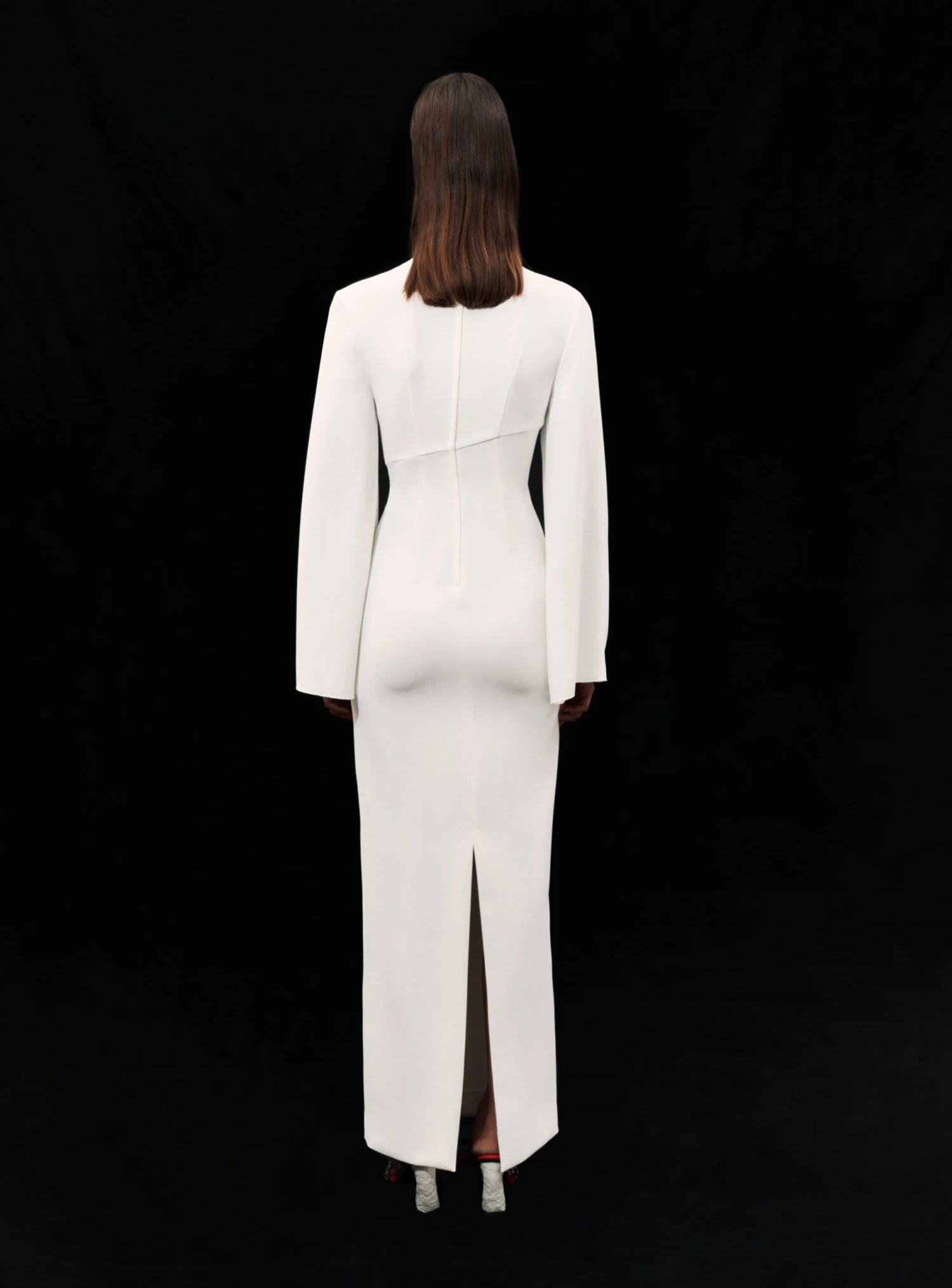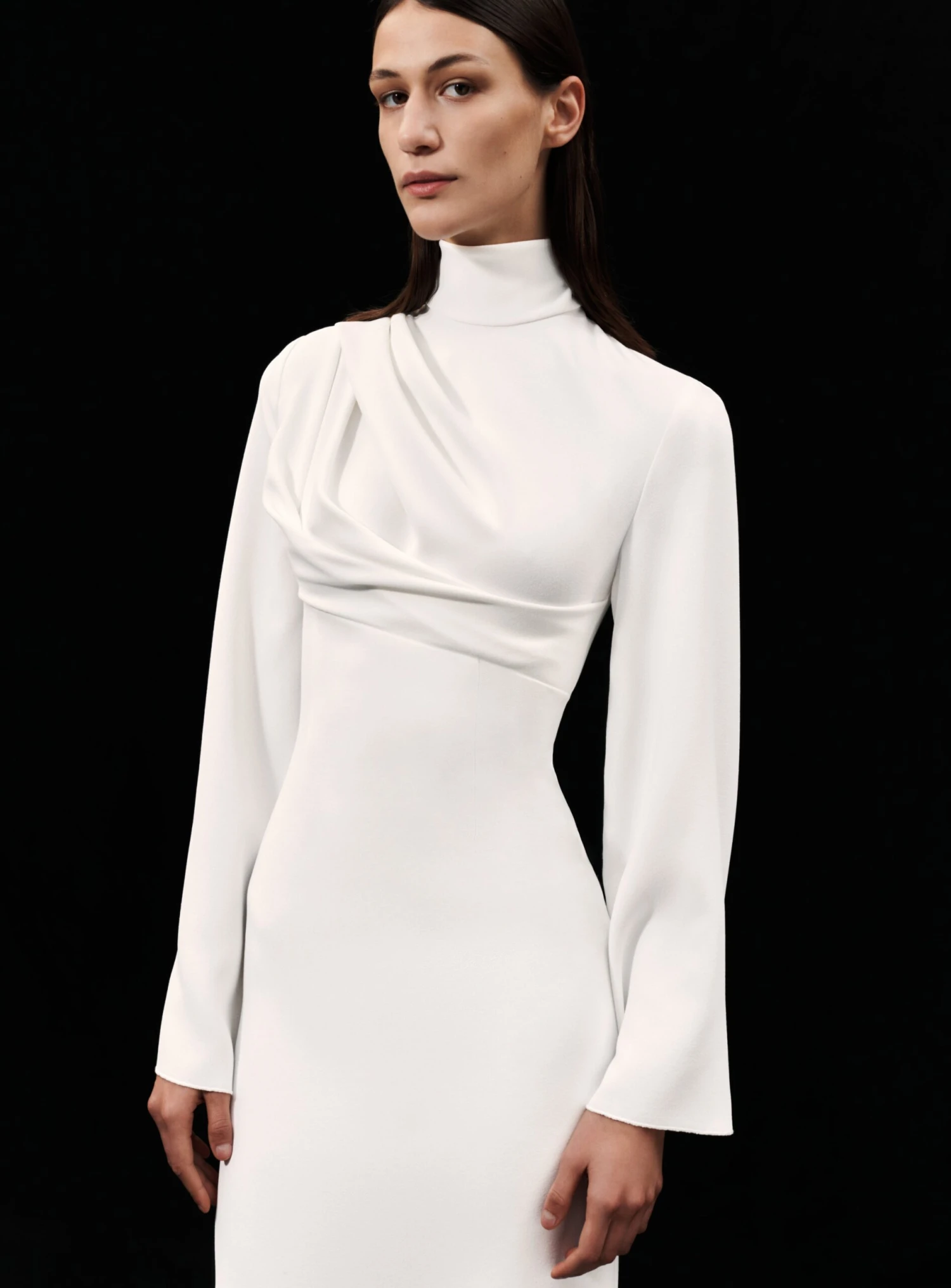 The Lia is a body skimming floor length gown featuring a contrast draped bodice and high-neck.