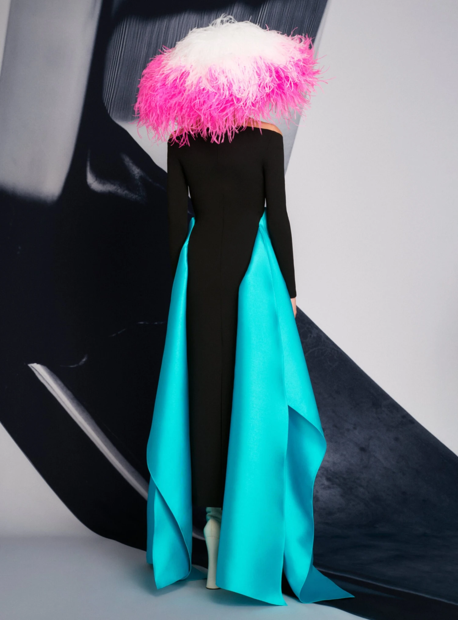 The Livia is a strapless gown with a dramatic contrasting draped sash.