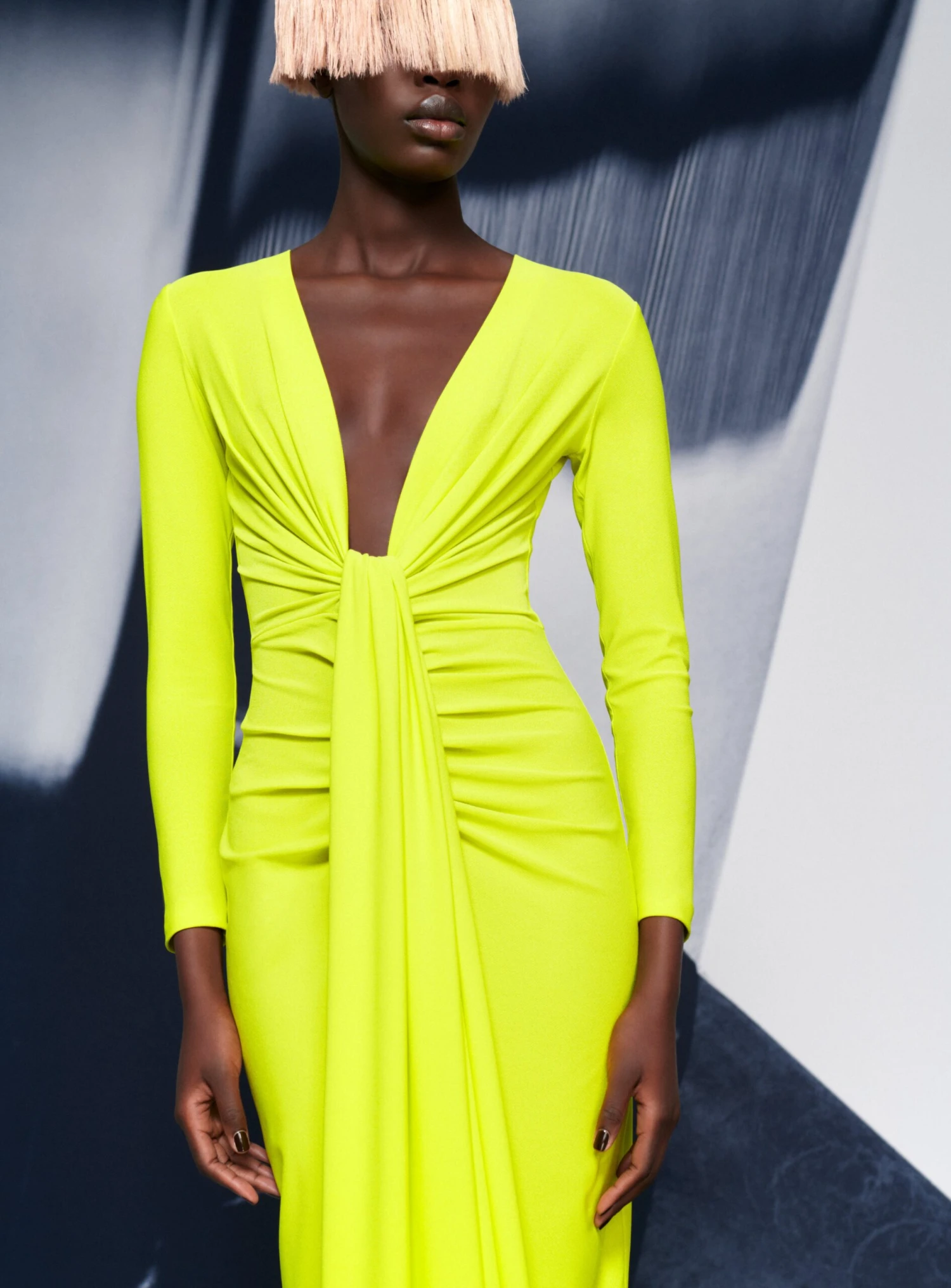 The Lorena is a sleek midi style featuring a plunging neckline and integrated tied waterfall sash.