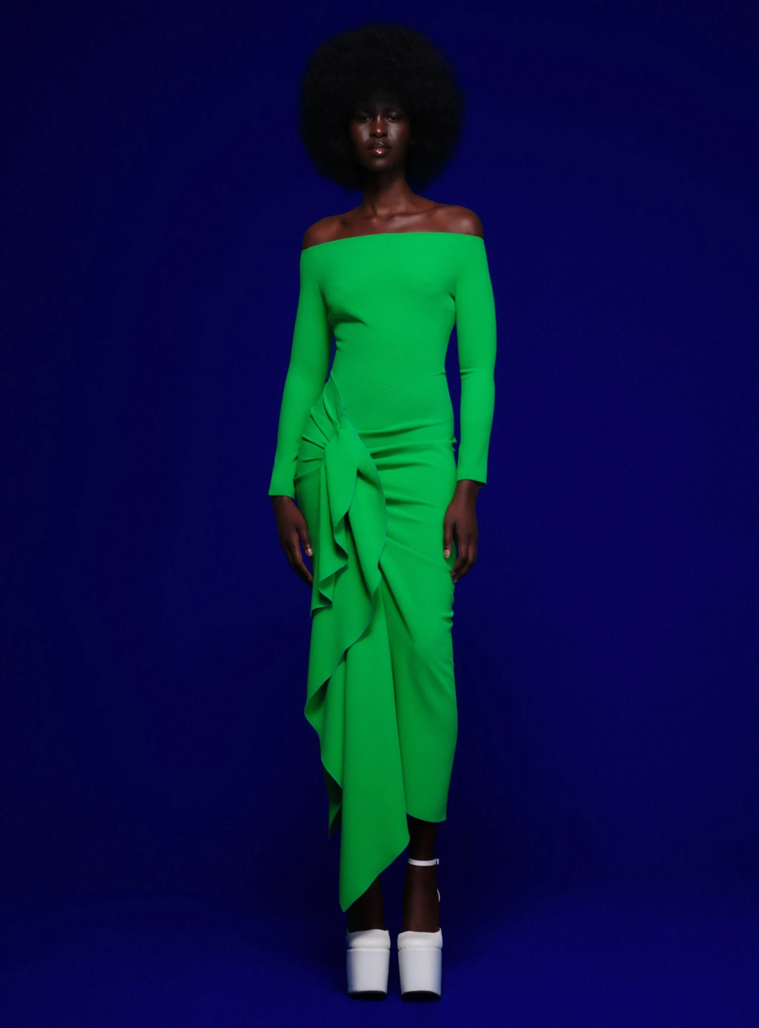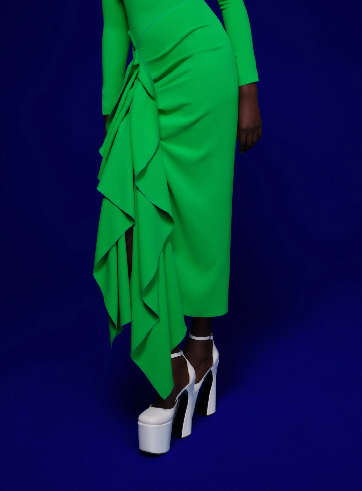 The Lotus is a sculptural midaxi style featuring a waterfall ruffle draped skirt and contrasting bodice.