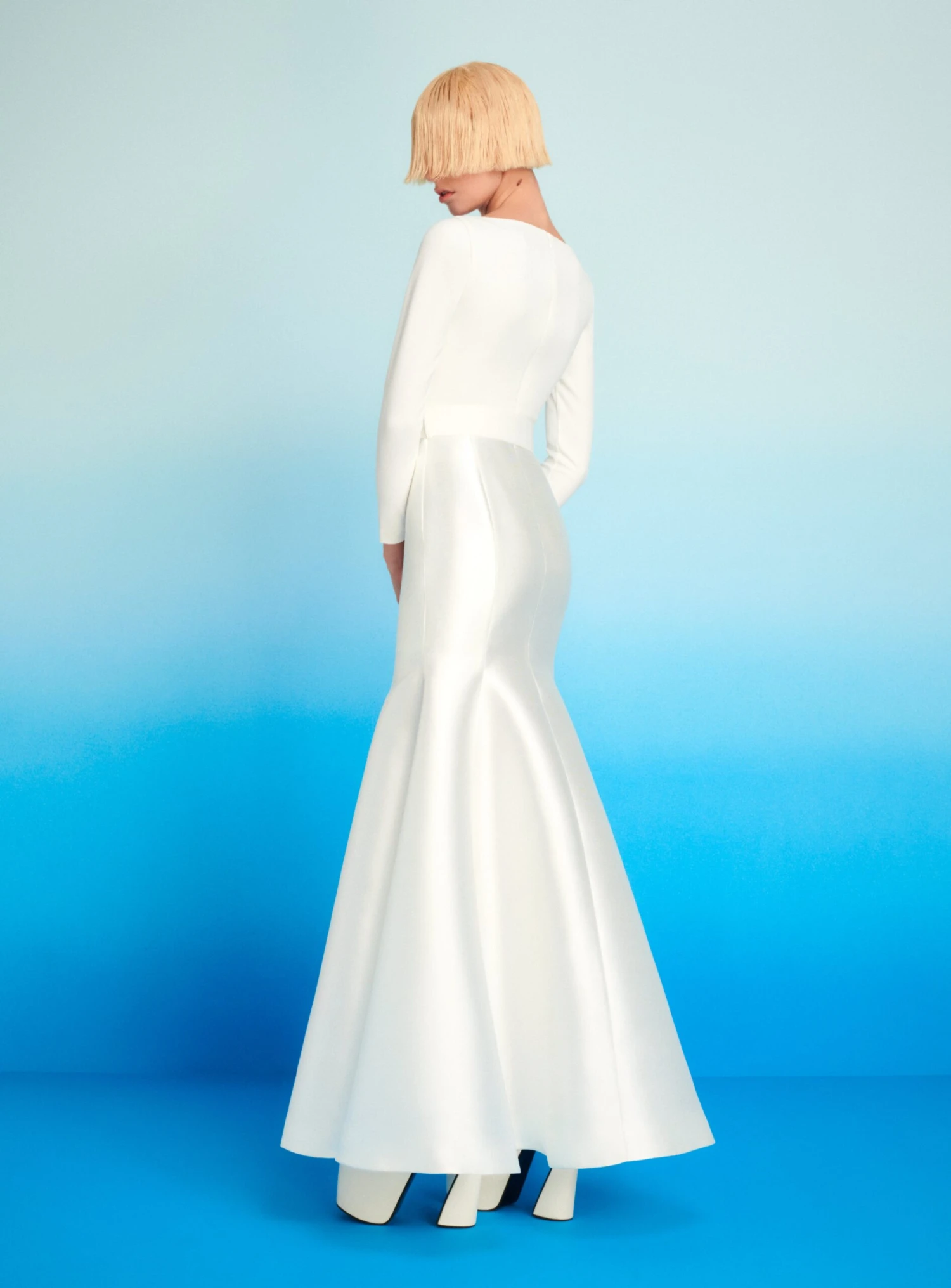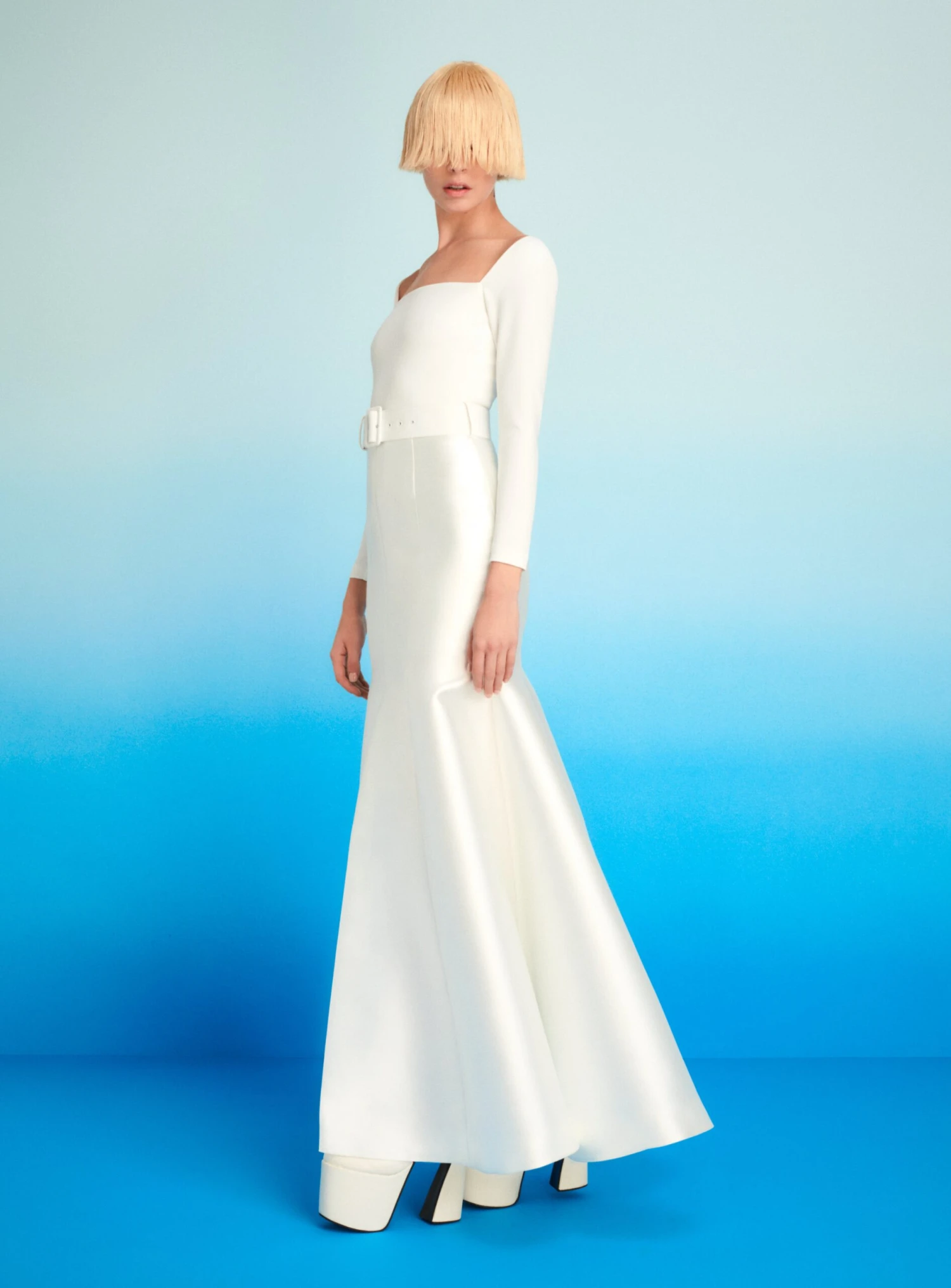 The Mabel features an exaggerated wide square neckline and dramatic flared skirt with centre front split.