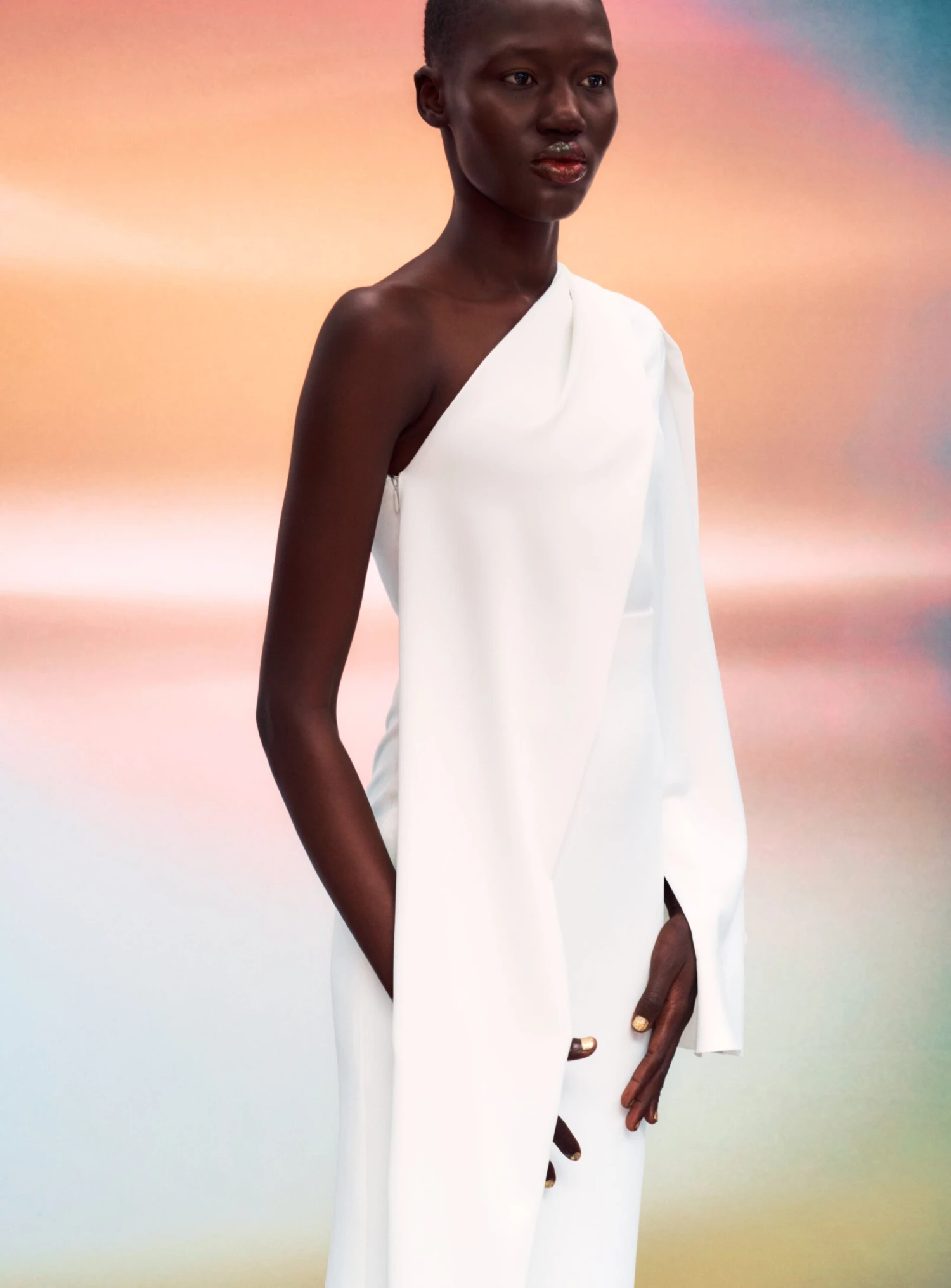 The Marcelle is a maxi asymmetric style with an extended sash detail and softly draped flared sleeve.