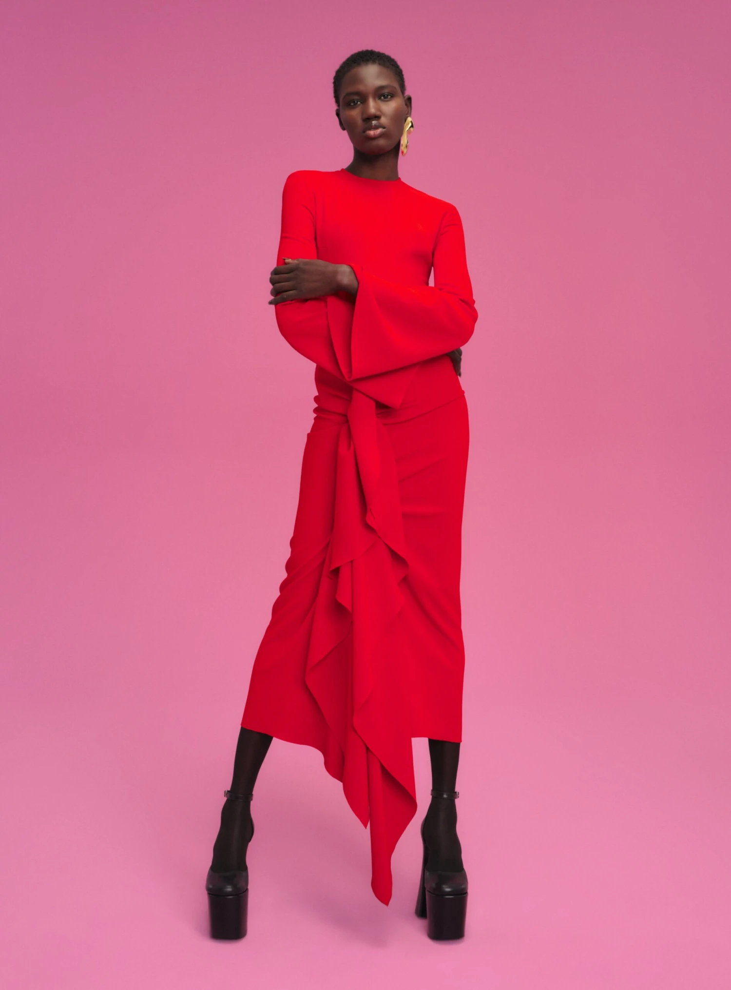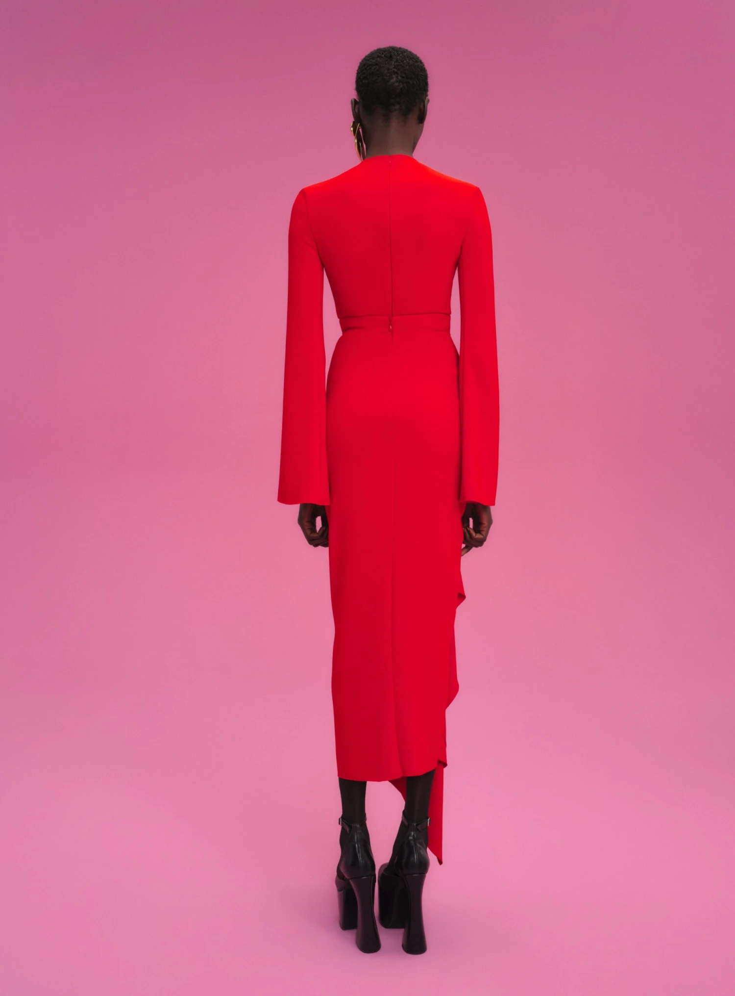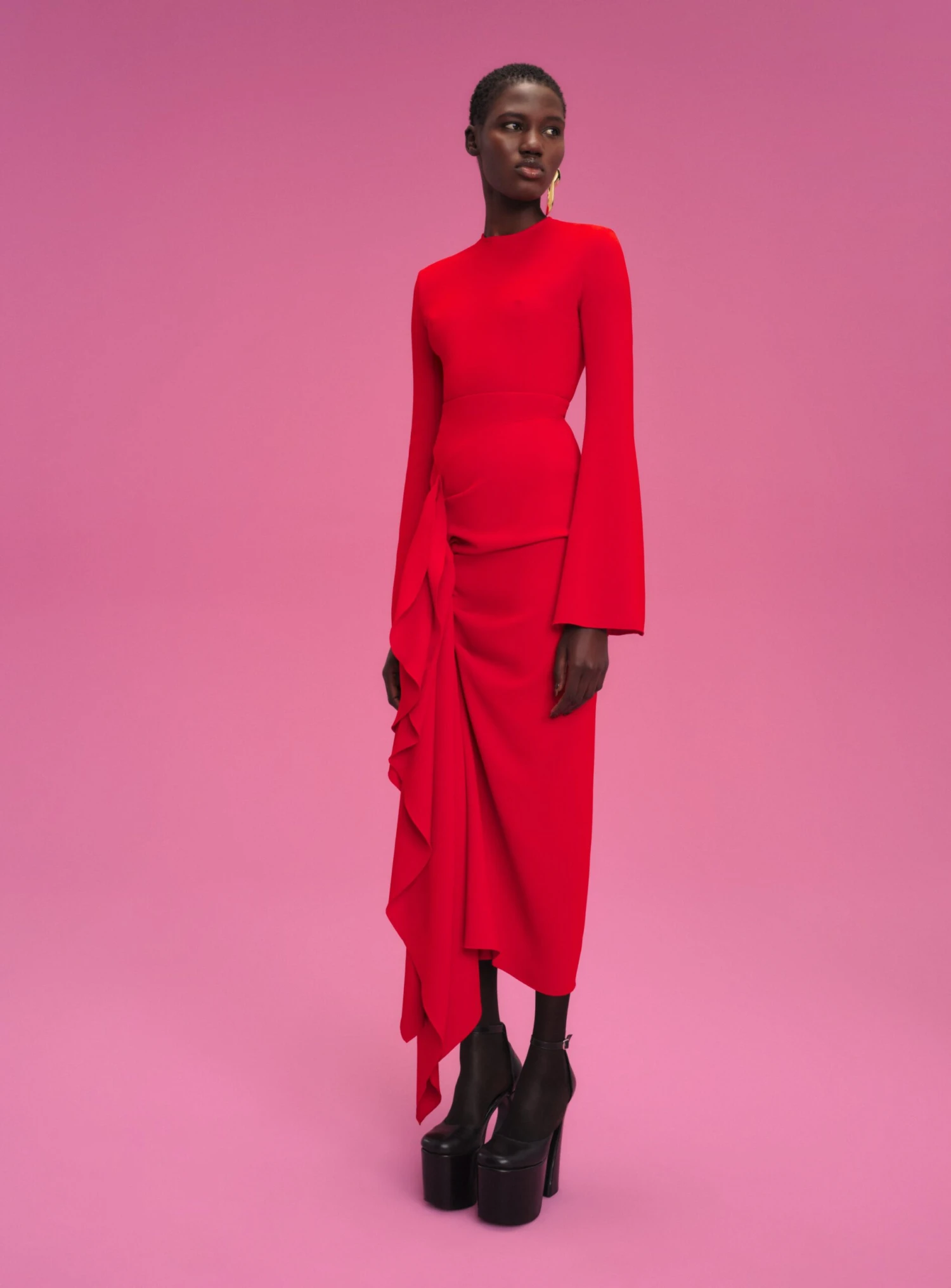 The Nahla features a dramatic fluted sleeve and high round neckline.