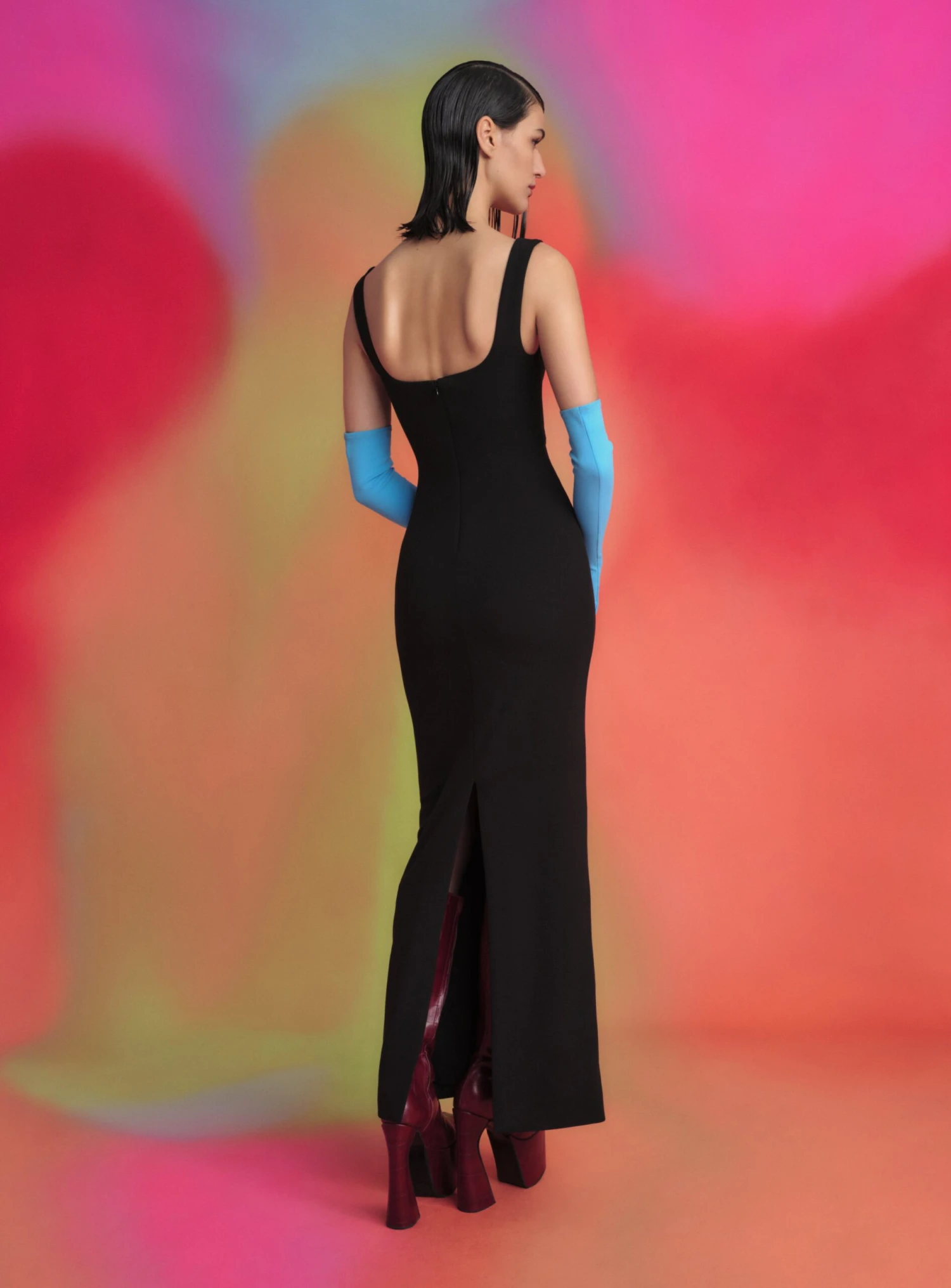 The Orla is a full length gown featuring a column skirt and a graphic square neckline.