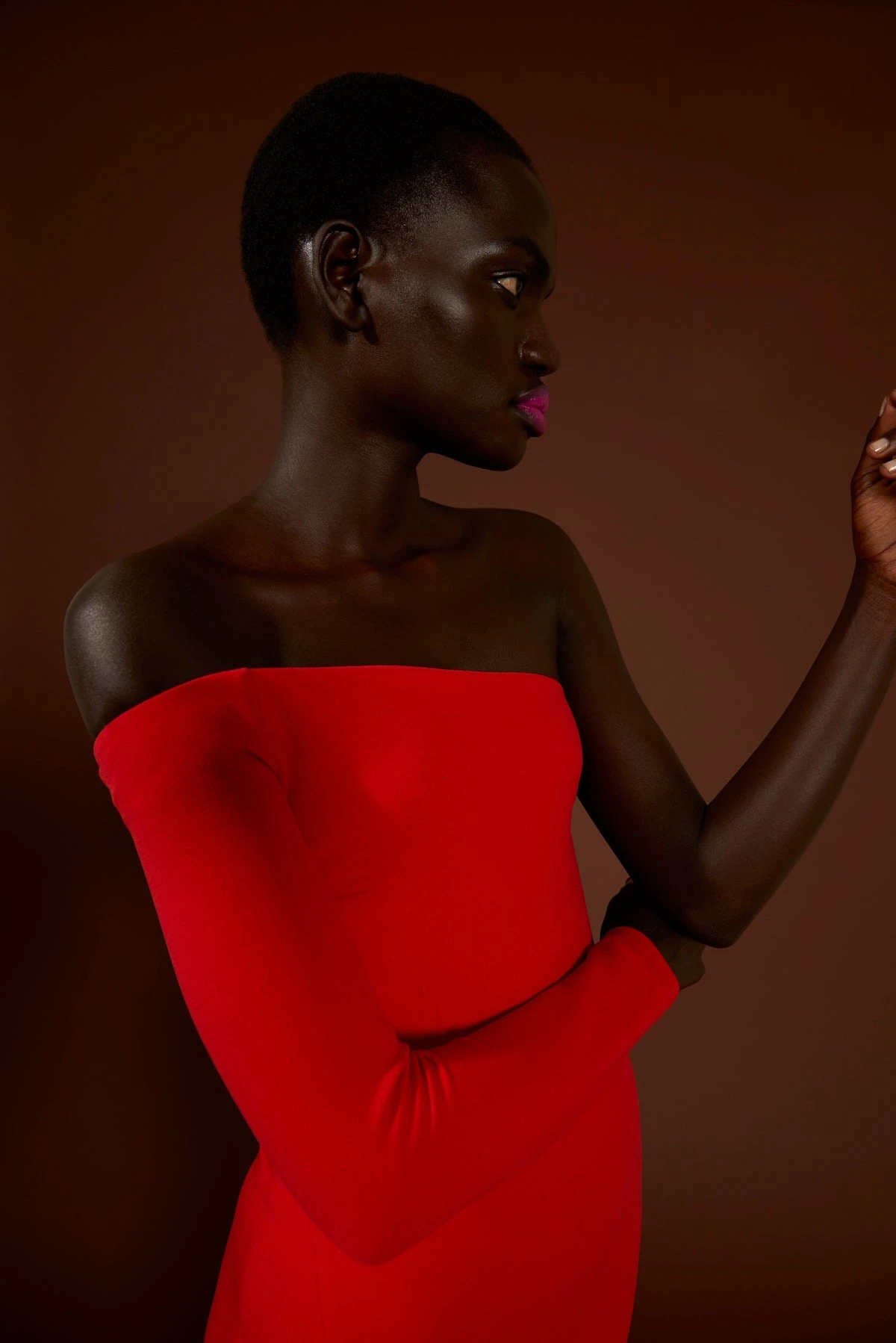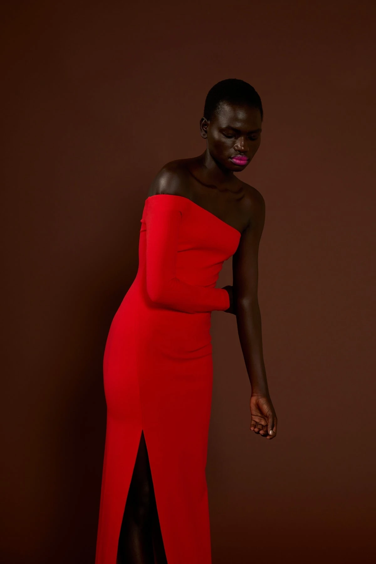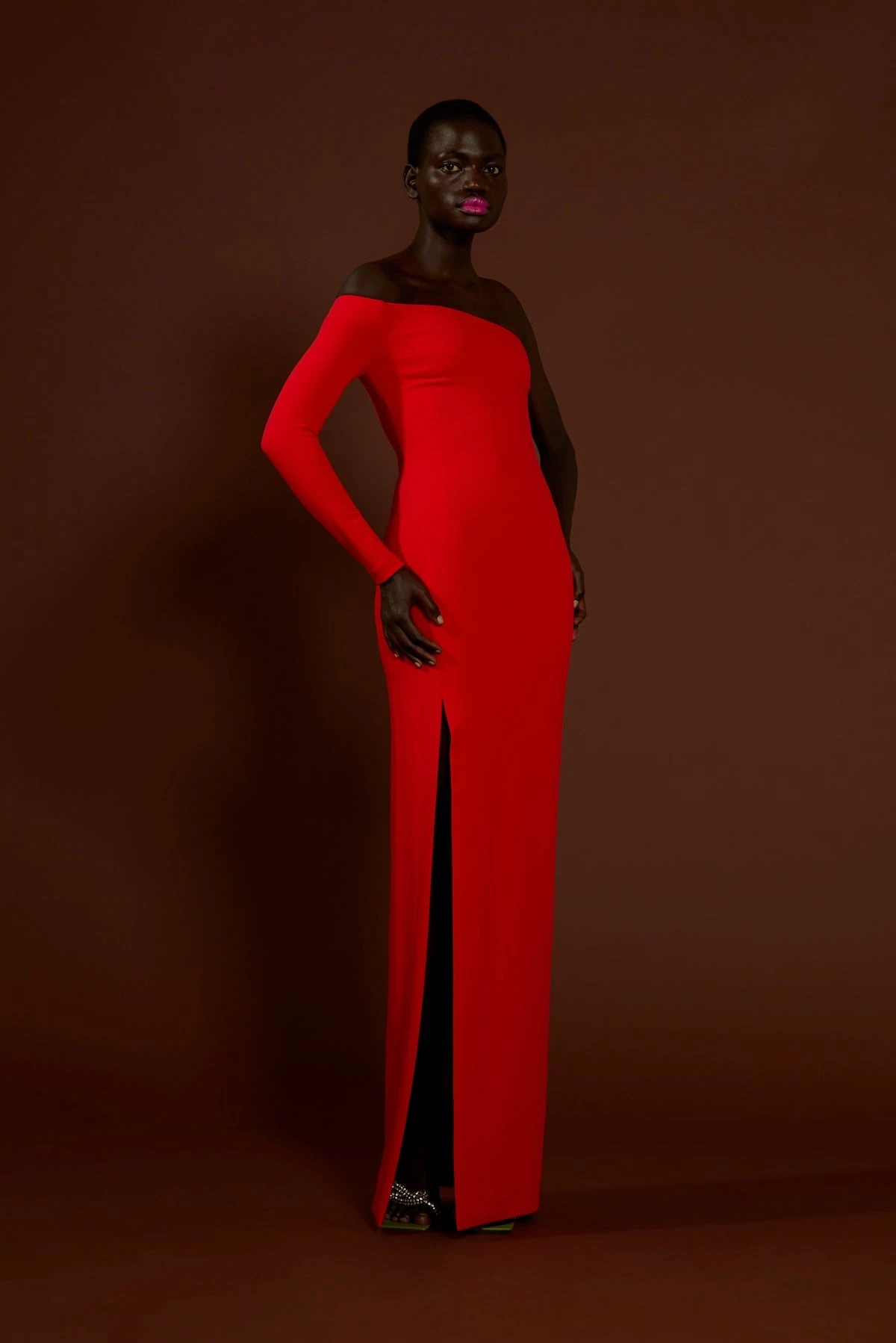 The Palmer is an asymmetric one-sleeve gown with an extreme off the shoulder neckline.