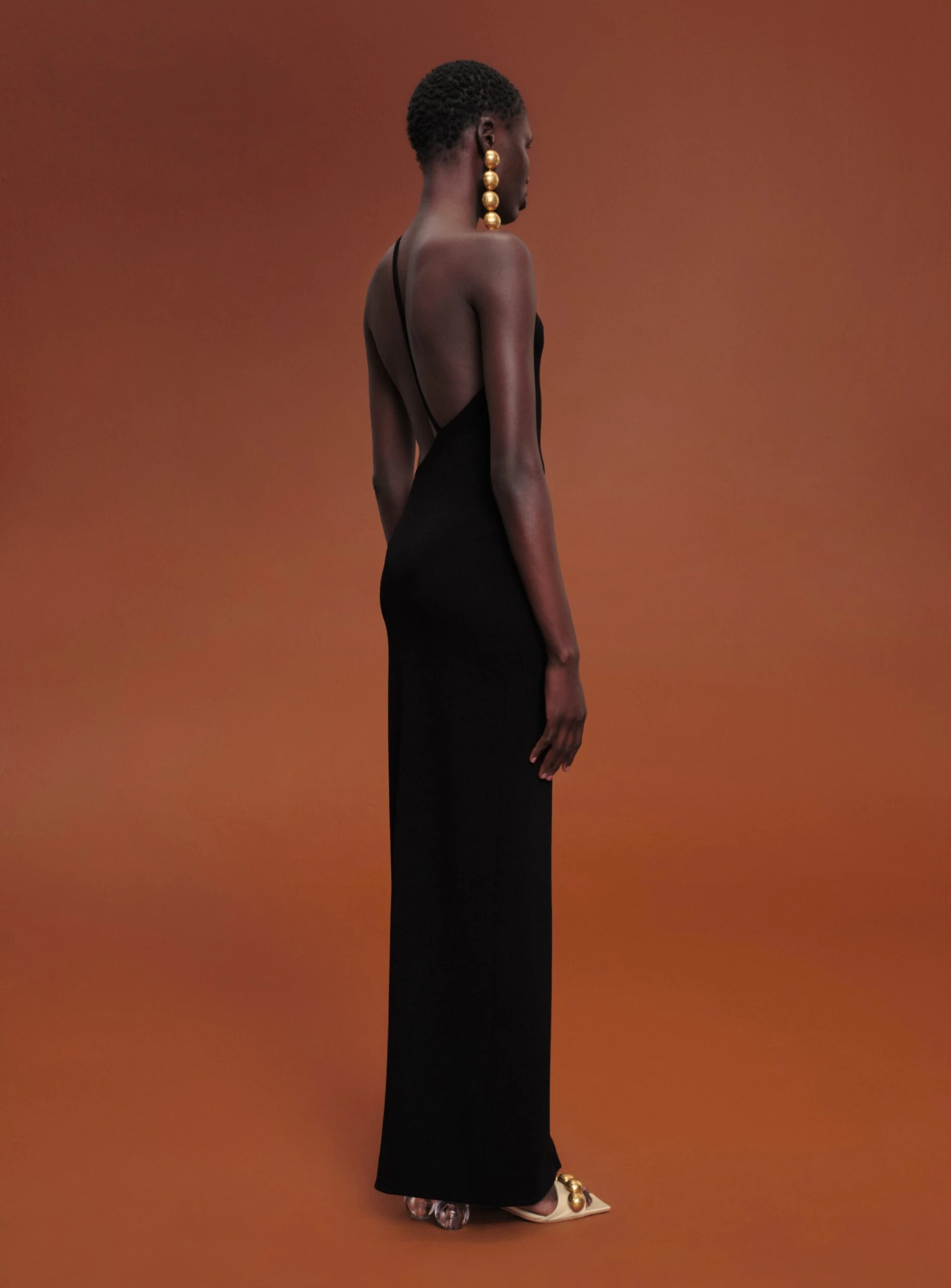 The Petch is a body conscious asymmetric one shoulder style with signature thigh split.