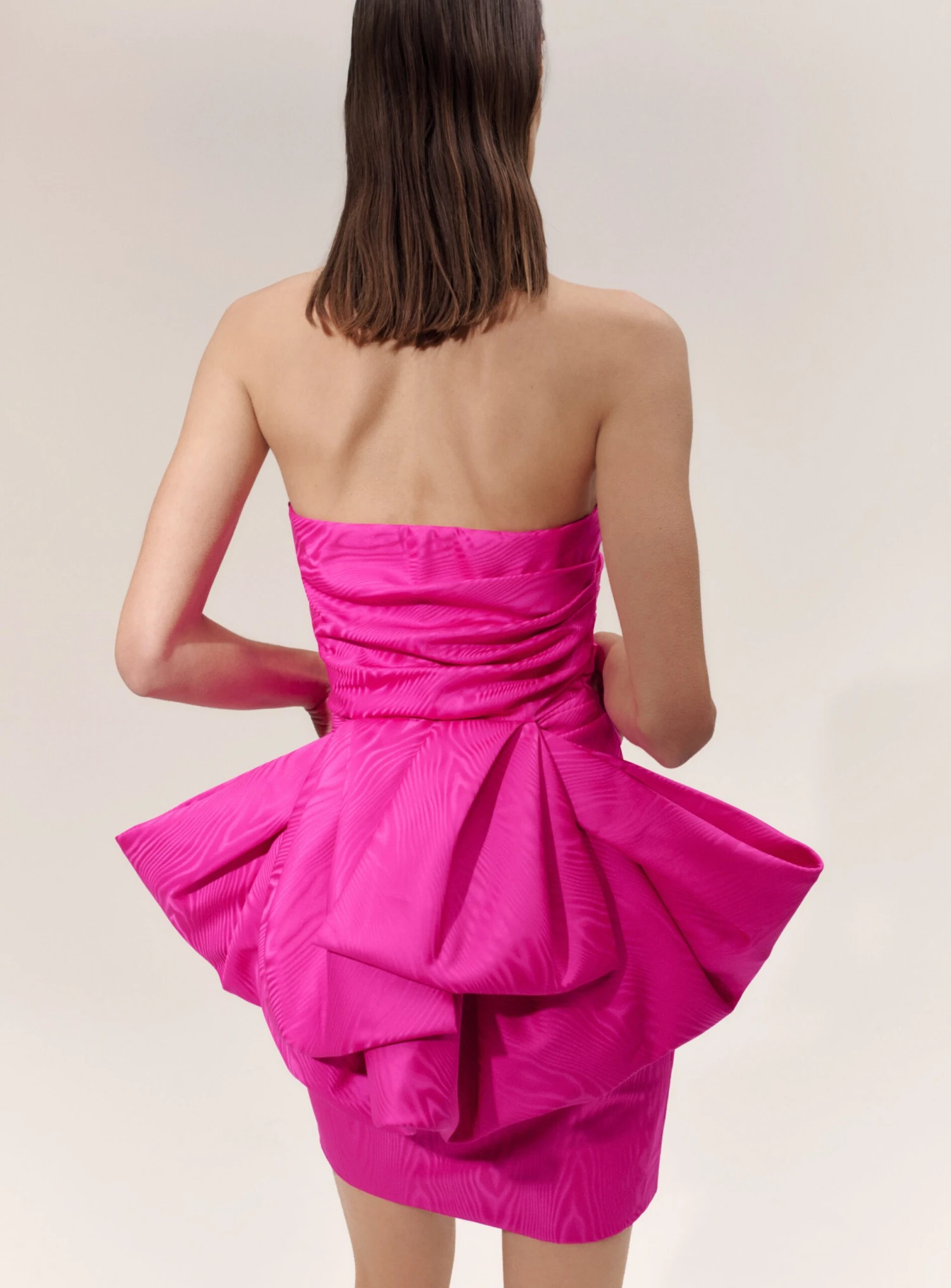The Posie is a strapless mini style featuring soft drapes and a dramatic bustle.