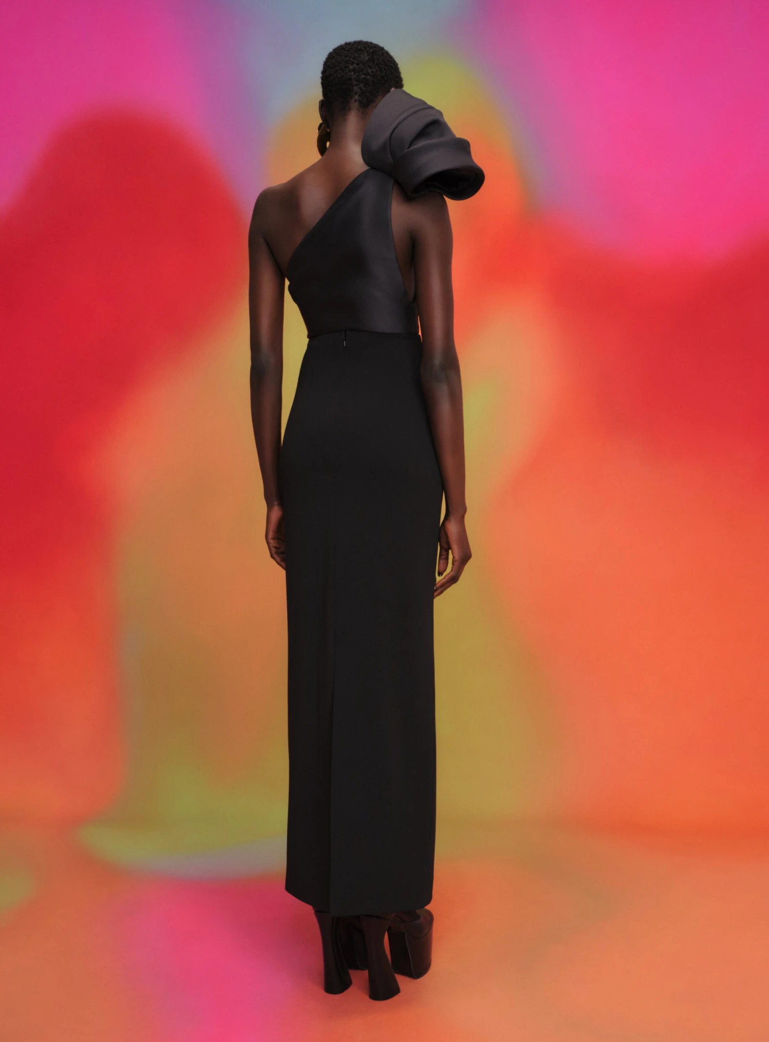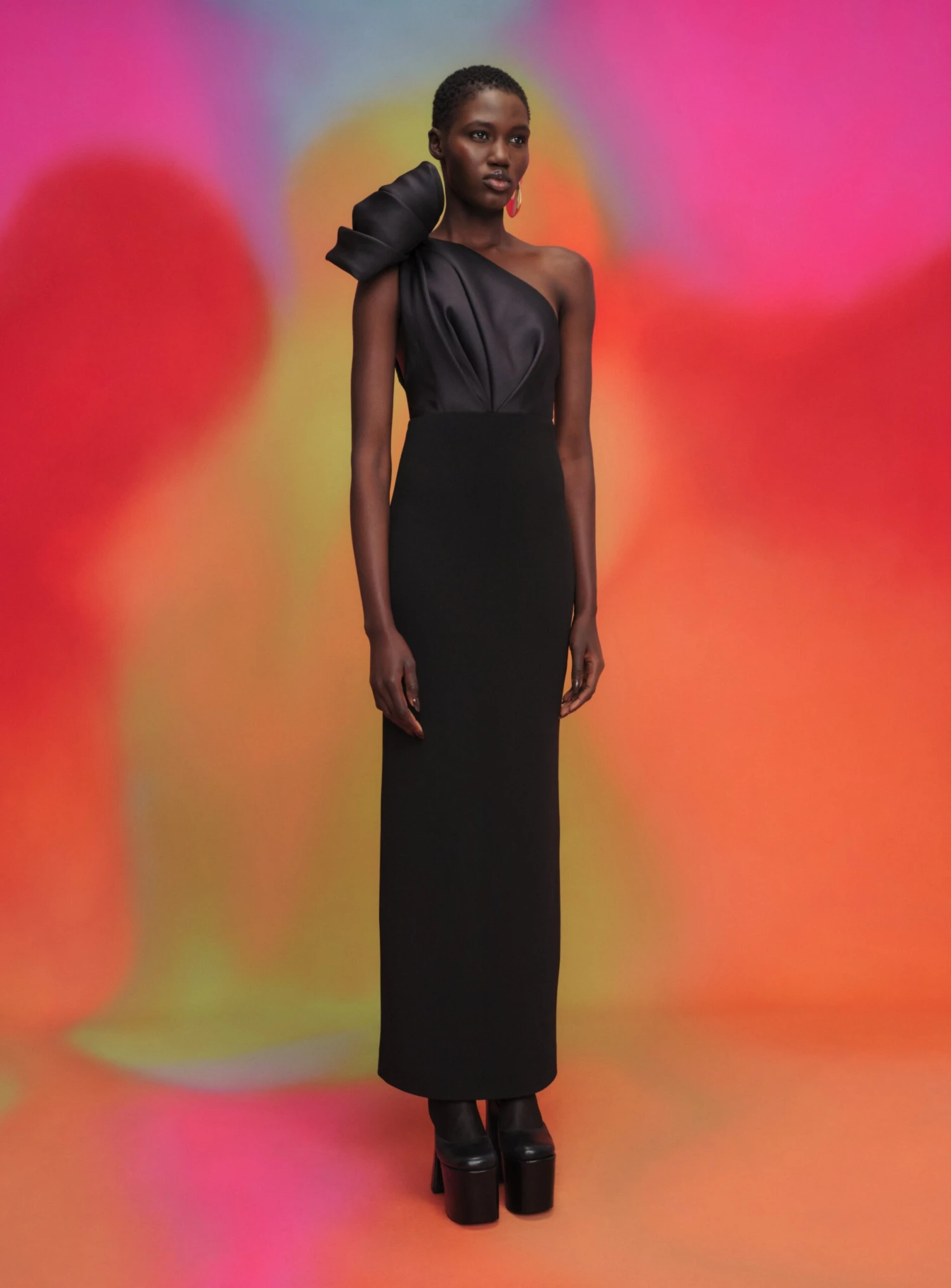 The Rennie is a floor length maxi dress dress featuring a column skirt and a pleated sculptural bodice.