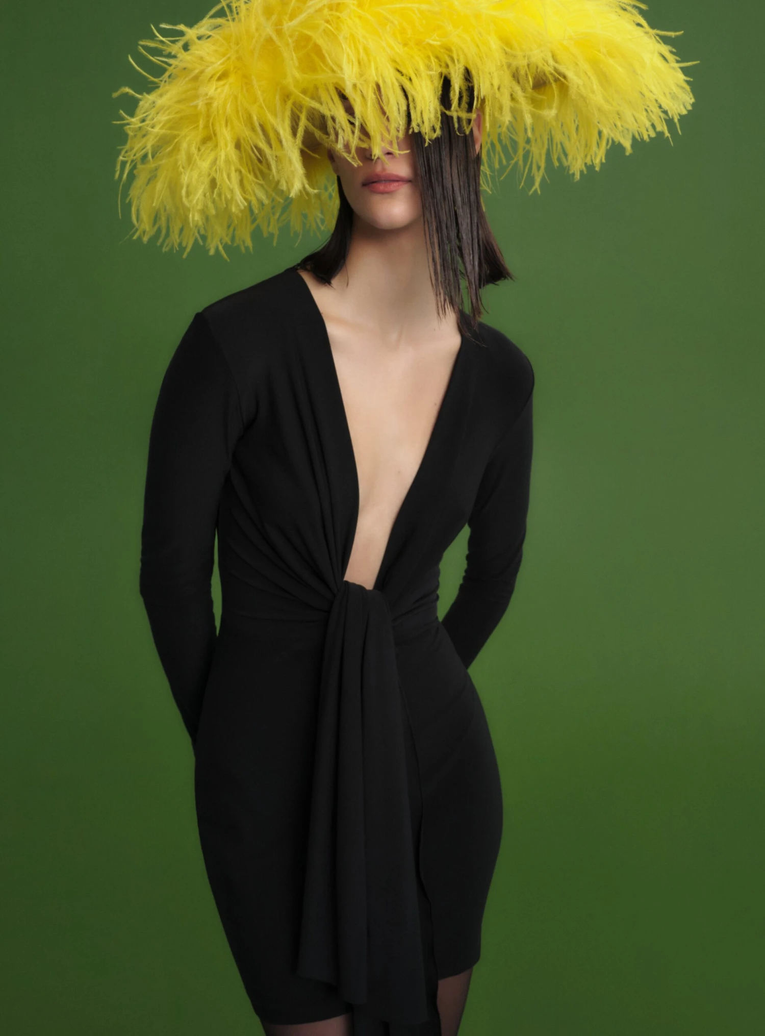 The Renzo features a plunging tied neckline and is a mini length.