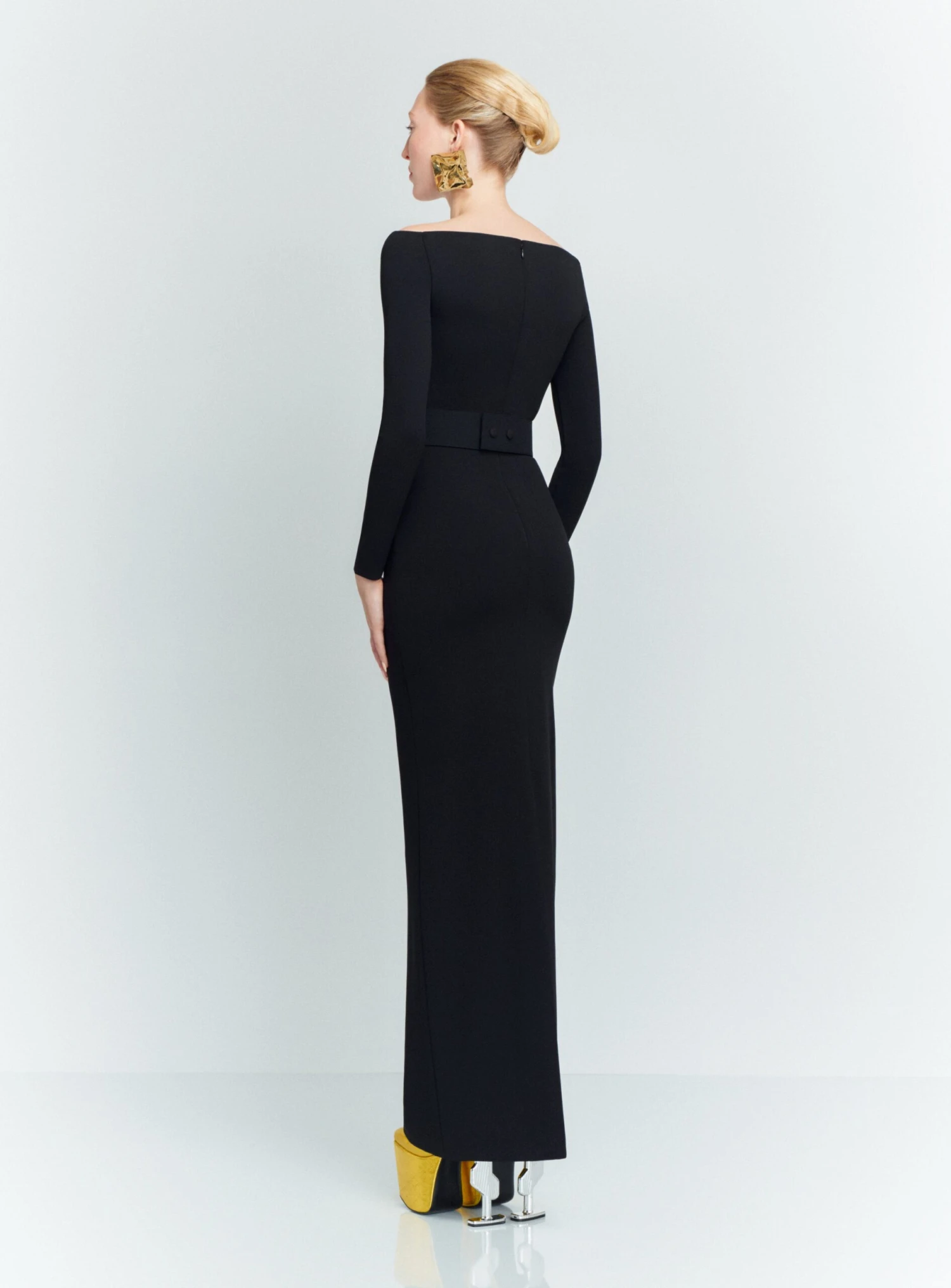 The Sabina is floor length modern gown featuring an exaggerated neckline.