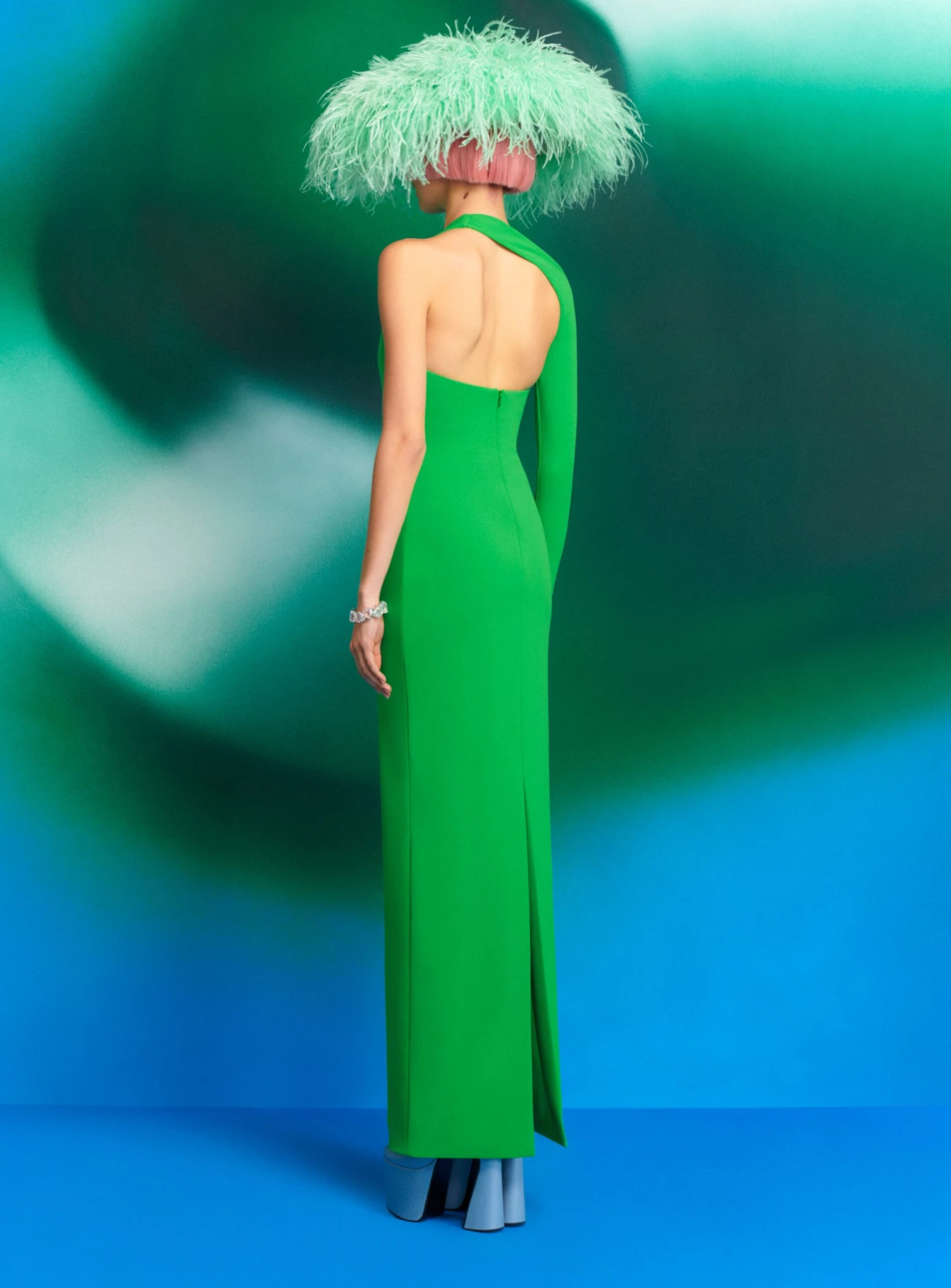 The Saren is a sleek one shoulder column style featuring graphic cut-out back detail.
