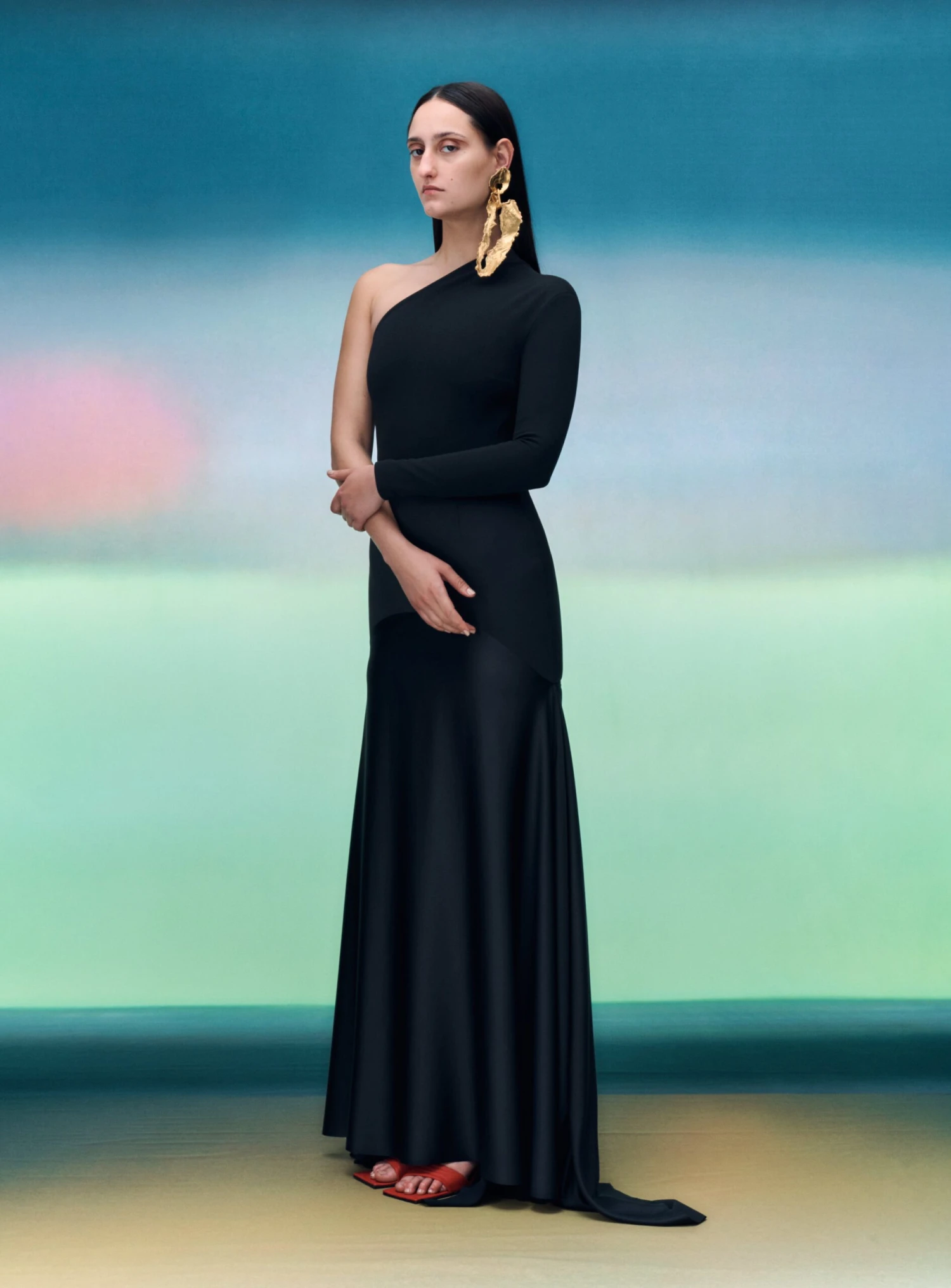 The Sarr is a modern one shoulder gown with moulded neckline and softly draped skirt.