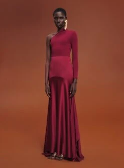 The Sydney is a corseted mini dress with dramatic floor length draping.