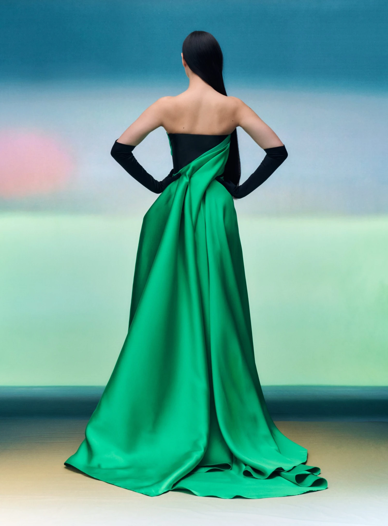 The Veronica is a strapless floor length gown featuring a softly pleated bodice and wrap around drape detail.