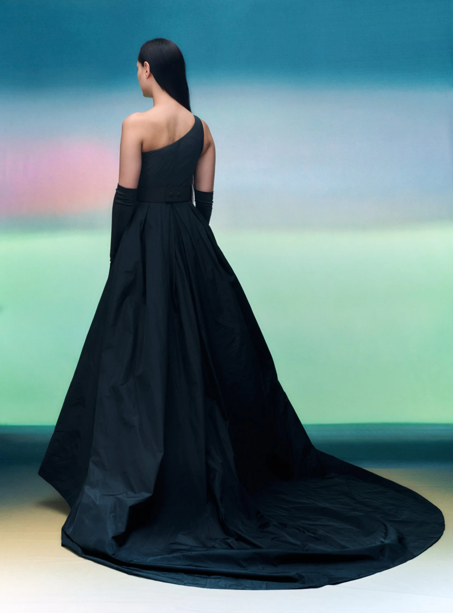 The Xelia is a dramatic one shoulder gown featuring a multi layered voluminous skirt.