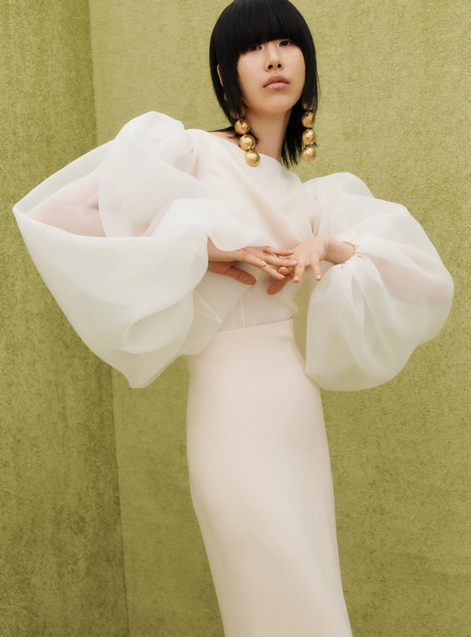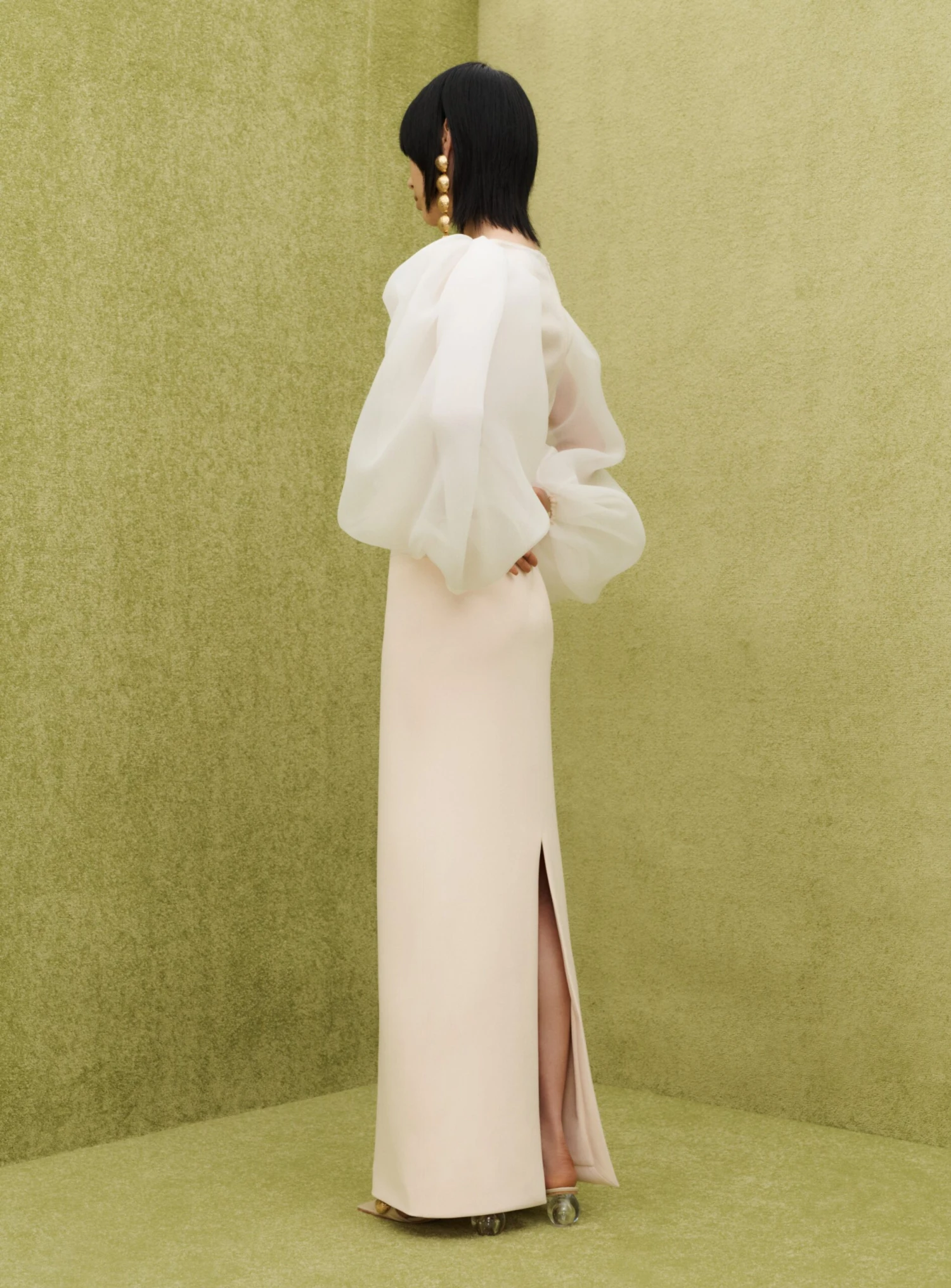 The Ziya is a modern gown with voluminous double layer organza sleeves.